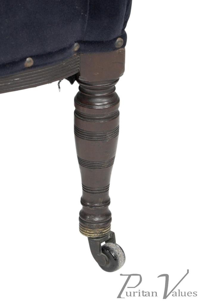 A fine Anglo-Japanese mahogany settee, with subtle Japonesque detailing to the back uprights. Each arm turns out in the Japanese style, with finely carved foliate details to the upper fronts and fine turnings to the lower back and below the arms, on finely turned legs with treble ribbed brass and ceramic castors, stamped mark to back leg.