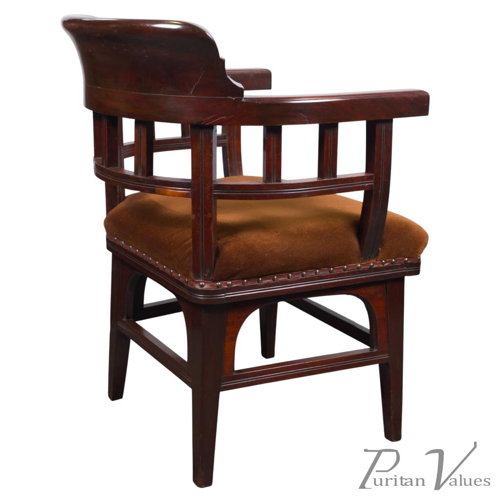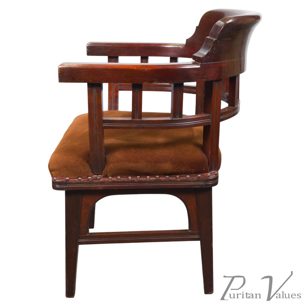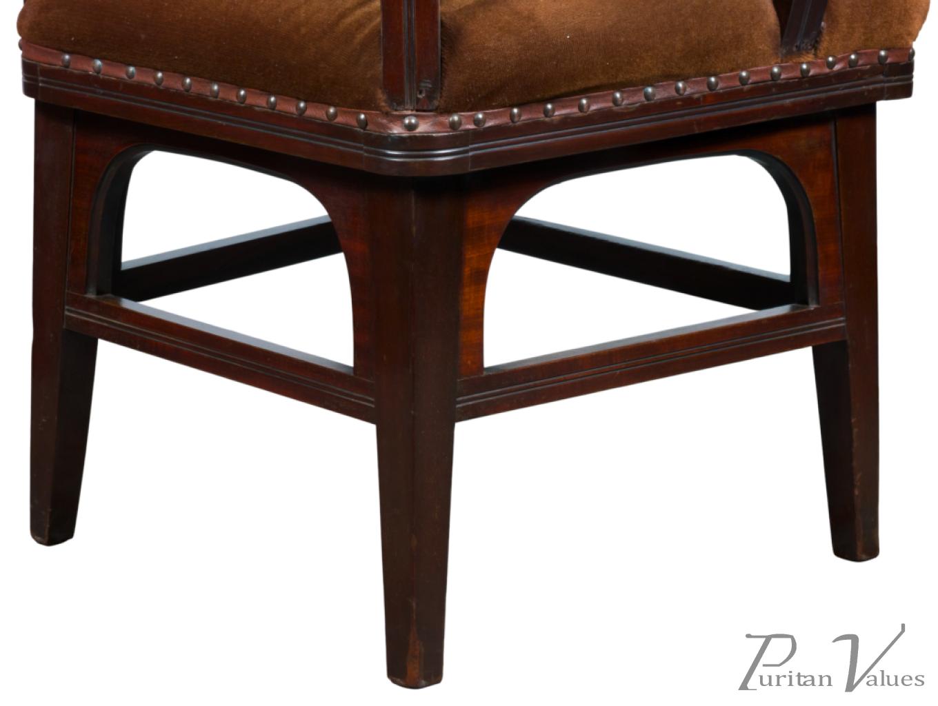 Collinson & Lock, attributed, armchair in mahogany, with velvet seat. Aesthetic Movement (1860–1890), c.1870, English, Victorian. Compact wraparound form intended for desk, library, or occasional seating, with a continuous curved back and broad arms set over incised uprights.