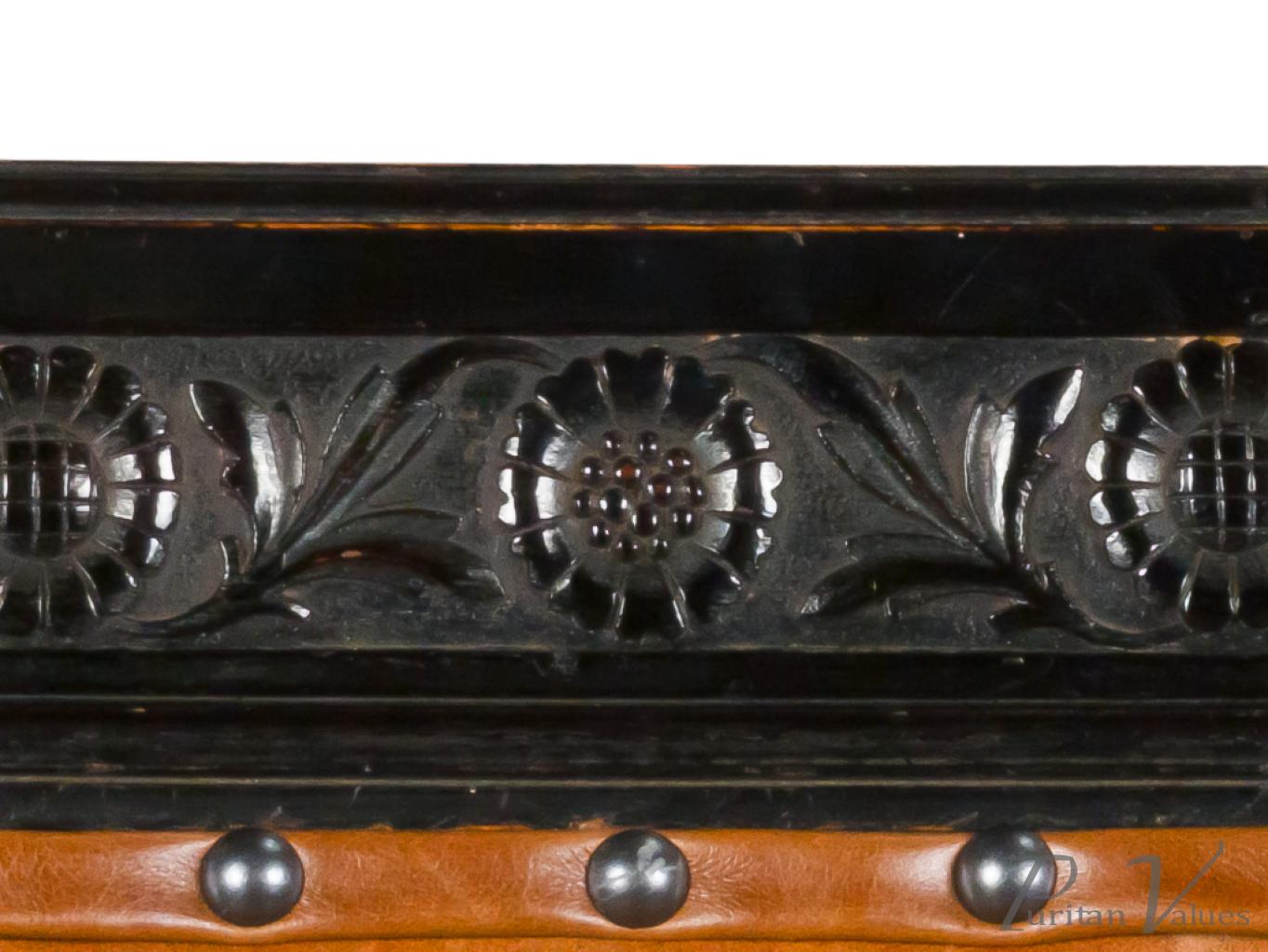 The padded leather back panel is secured with studding within a moulded frame, flanked by shaped inner returns, with an arched back rail and small turned spindles below. The seat is similarly upholstered and studded, raised on ring turned front legs with brass castors, the rear legs raked, united by turned stretchers. The attribution is supported by the distinctive sunflower carving and the back construction, which corresponds closely to a chair shown in an interior photograph of the drawing room at Kepplestone House, Aberdeen, decorated and furnished by Cottier, c.1875, reproduced on the back cover of Daniel Cottier, Designer Decorator Dealer.