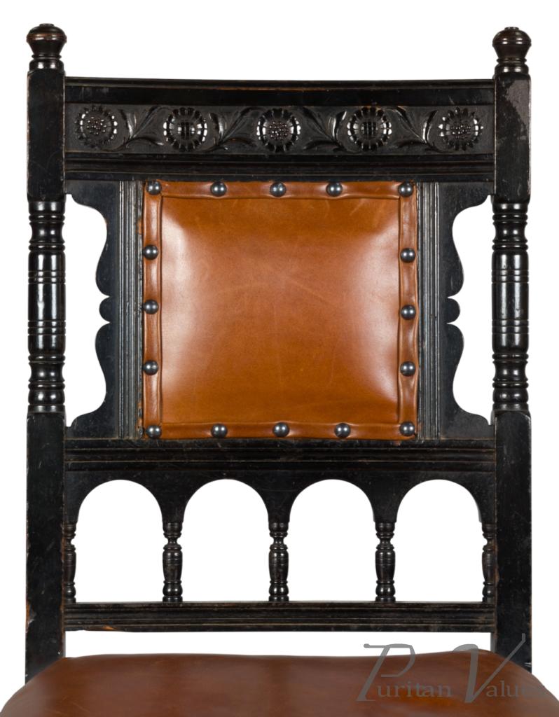 By Daniel Cottier, attributed, an Aesthetic Movement side chair in ebonised wood, aligned to the Aesthetic Movement (1860–1890), c.1875, British, Victorian. Upright, architectural form with turned finials, square then turned uprights, and a carved head rail worked with sunflower florets and foliate scrollwork.