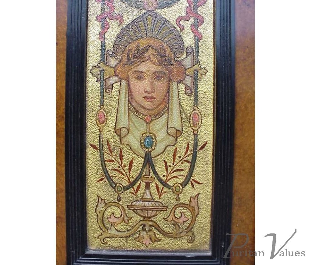 Daniel Cottier attributed. An impressive Aesthetic Movement ebonised cabinet for semi-fixing, with a gentle play of upper open shelves with turned uprights and turned legs and decorative brass beadings, gilt highlights, amboyna inlay to the central drawer and doors with painted panels of maidens amidst classical swags in the Greek style. The handles and hinges are identical to those used on many pieces designed by Talbert and made by Gillows. Circa 1870's. Height 75", Width 29 3/4", Depth 13".