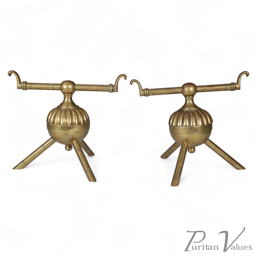 Each fire dog is constructed in cast brass with a spherical central body raised on three splayed legs and surmounted by a crossbar handle ending in stylised scrolls. The simplicity of their functional geometry demonstrates Dresser’s conviction that design should be guided by utility and clarity of form. The manufacturer Benham and Froud, noted for their collaboration with Dresser, produced numerous domestic metalwares that balanced factory production with artistic intent.