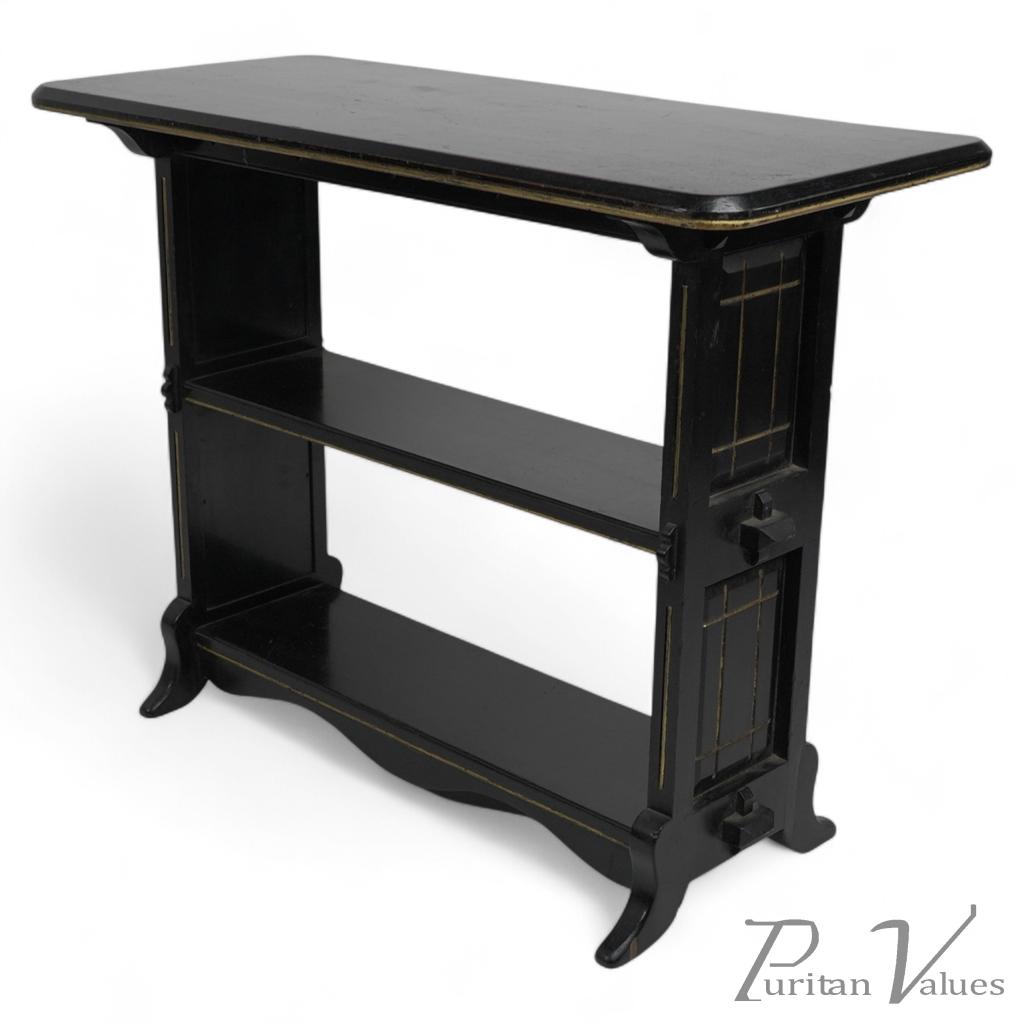 An Aesthetic Movement three-tier ebonized and incised parcel gilt oblong library or side table. Gilded and with carved star details to the apron below, through tenon and pegged construction uniting all three tiers.