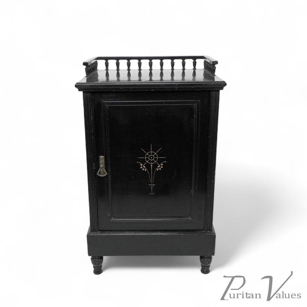A fine English Aesthetic Movement ebonized walnut bedside cabinet with a three-quarter gallery to the top, a single panelled door below with an incised and gilded stylized floral detail to the centre, adjacent to the original brass handle. The whole on squat turned feet.