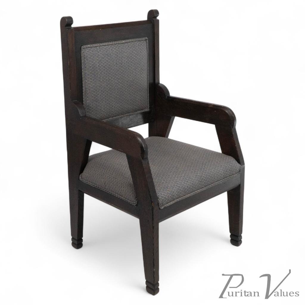 In the style of Dr Christopher Dresser, an ebonised armchair aligned to the Aesthetic Movement (1860–1900), c.1885. The chair presents a rectilinear frame with square legs, canted arms and a panelled back, the seat and back reupholstered in a durable blue fabric. The economy of line, planar panels and absence of applied ornament express the Anglo-Japanese taste that Dresser championed in the late nineteenth century. Construction and profile are consistent with period workshop practice and support a stylistic attribution rather than a signed or retailed example.