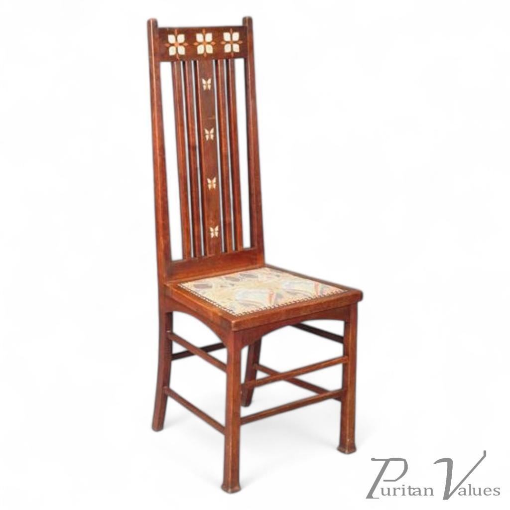 Ernest Archibald Taylor (1874-1951) for Wylie and Lochhead . A rare 'Butterfly' chair, the high back with satinwood and mother of pearl inlaid flowerheads to the head rail and inlaid butterflies to the central back, 83cm high This model was exhibited in the Wylie and Lochhead pavilion at The Glasgow International Exhibition in 1901 and was part of the complete and very accomplished scheme running through the drawing room he designed for the exhibition which was subsequently exhibited in Budapest in 1902. See 'Glasgow 1900: Art and Design', p.153, illus. 111 and 'An exhibition catalogue to coincide with the exhibition held at The Van Gogh Museum in Amsterdam' 20th November 1992 - 7th February 1993, p.108, illus. 3.10.