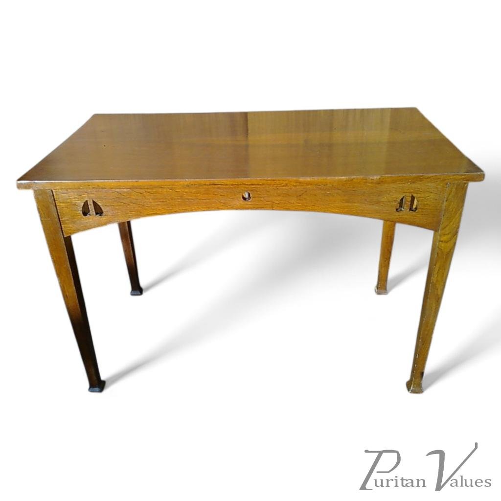 A top quality Glasgow School Arts and Crafts quarter sawn oak oblong table designed by E.A.Taylor and made by Wylie and Lochhead with full sweeping sides which have very precise inverted twin heart cut-outs to each corner with a stylised central circular cut-out with the most subtle notch to each top of the circle a wonderful detail, the whole on fine square tapering legs with shaped square feet. Circa 1902.