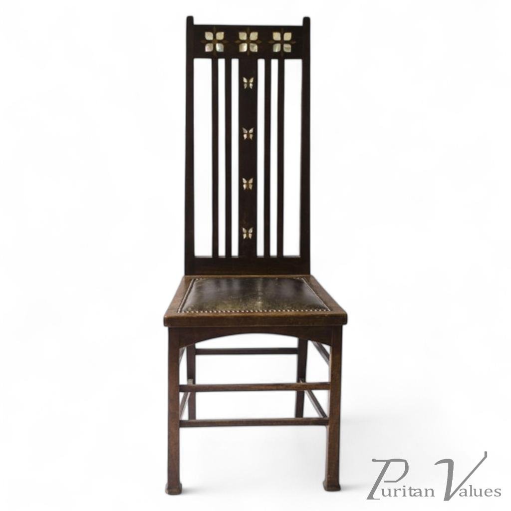 The Butterfly chair designed by E.A.Taylor and made by Wylie and Lochhead for the 1901 Pavilion Exhibition. An important documented work of Art with Mother of Pearl and walnut inlaid Butterflies and stylised flower heads.