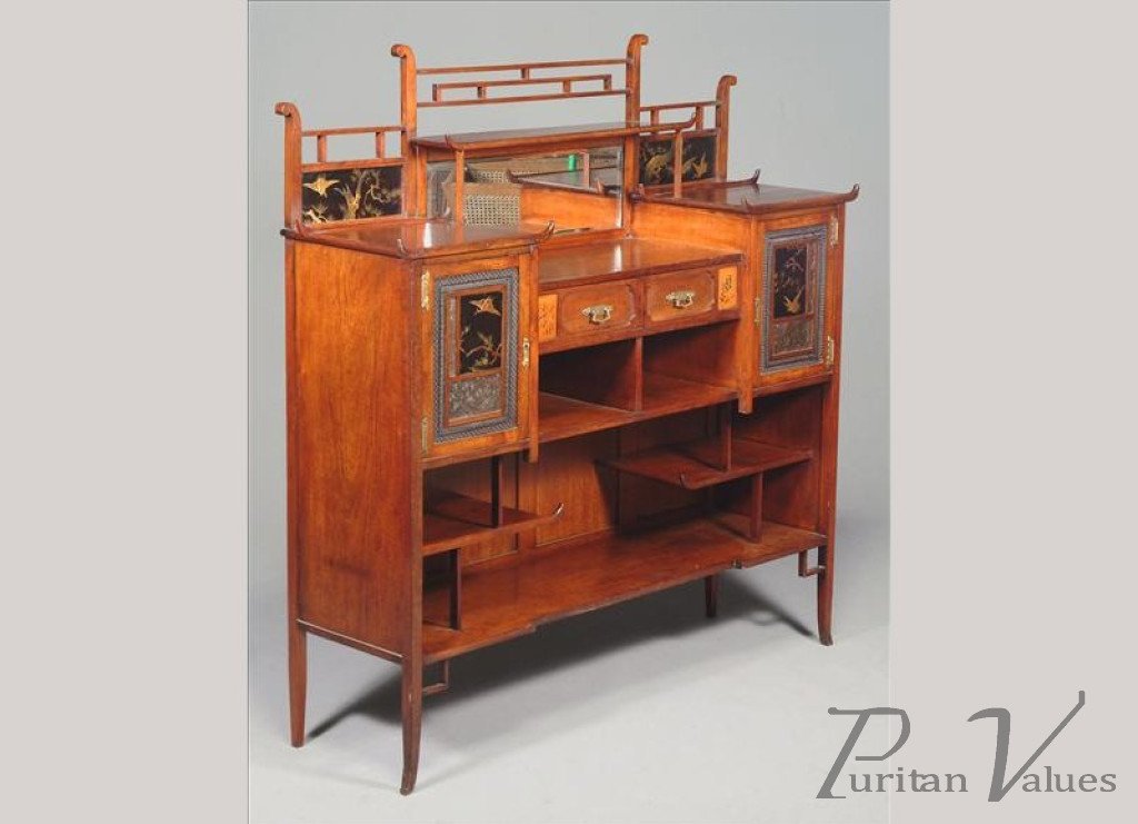 A rare Anglo-Japanese walnut and lacquer 'Pagoda' side cabinet, possibly designed by E.W. Godwin, with Japanese fretwork back inset with Japanese lacquer panels, with mirror to the centre and stepped shelved arrangement with upcurves, with conforming Japanese lacquer panels to the doors which also have Japanese style embossed leather. And further Japanese lacquer panels in red to the drawers. And an arrangement of open shelves below with Anglo-Japanese supports on splayed legs, 125cm high, 127cm wide, 37cm deep. See Soros, Susan Weber 'The Secular Furniture of E.W. Godwin', p. 212, illus. 337; p. 214, illus. 340; p. 219, illus. 347; and p. 165, illus. 234 .