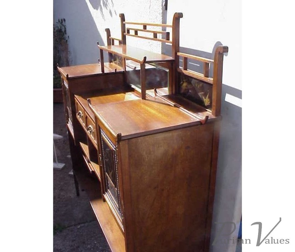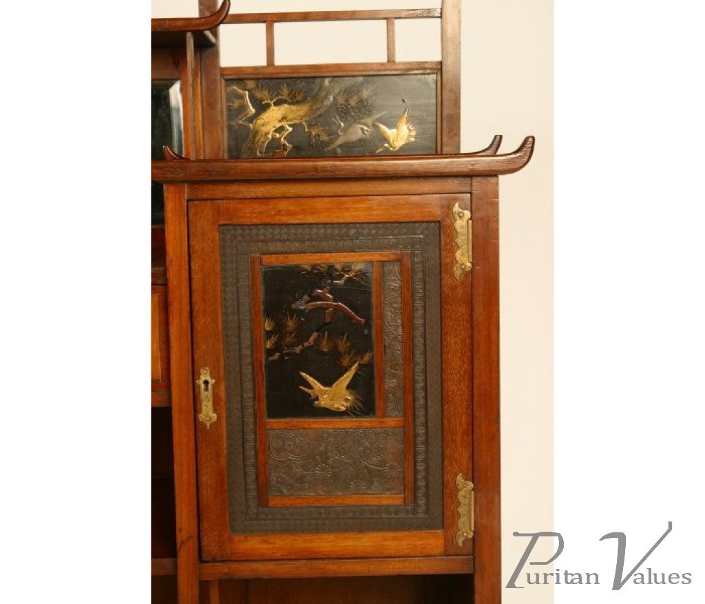 A rare Anglo-Japanese walnut and lacquer side cabinet, possibly designed by E.W. Godwin, with Japanese fret work back inset with Japanese laquer panels, with mirror to the centre and stepped shelve arrangement with upcurved details with conforming Japanese laquer panels to the doors which also have Japanese style leather embossed panels and further Japanese laquer panels in red to the drawers and an arrangement of open shelves below with Anglo-Japanese supports and on splayed legs. See Soros, Susan Weber ‘The Secular Furniture of E.W. Godwin’, p. 212, illus. 337 For identical shelf supports see Soros, p. 165, illus. 334; p. 214, illus. 340; and p.219, illus 347 In the style of E.W.Godwin. Circa 1875. Height 51" 125cm, Width 50" 127cm, Depth 14" 37cm.
