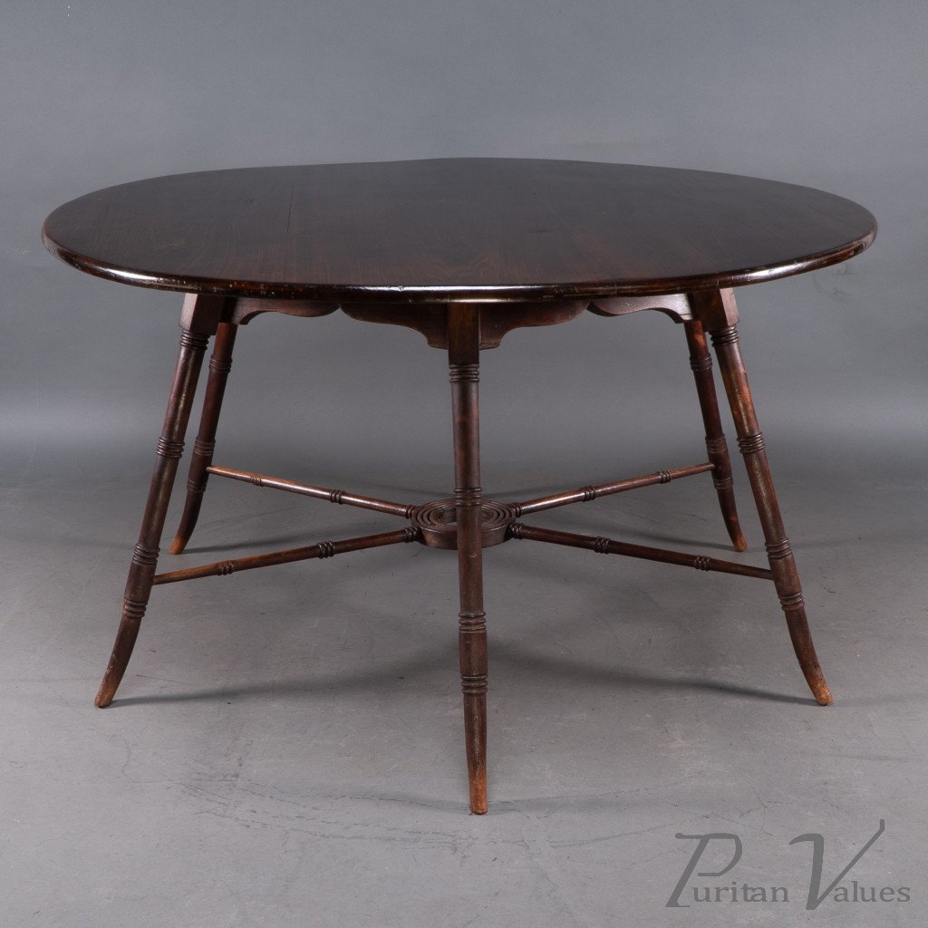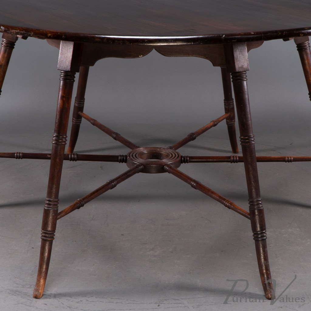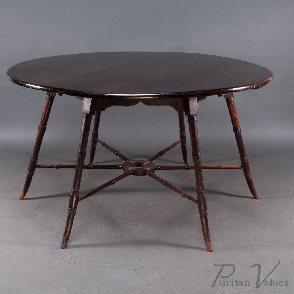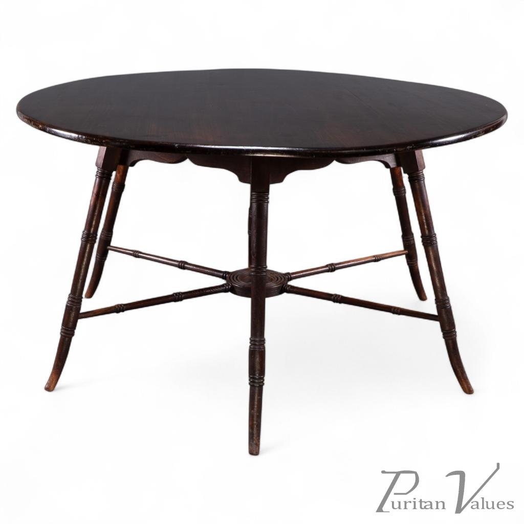 Probably made by Collinson & Lock. An Anglo-Japanese Aesthetic Movement walnut centre or dining table, with a large circular top with a shaped apron below, on six flaring turned legs, united by six radiating spoke stretchers to a central open ring.