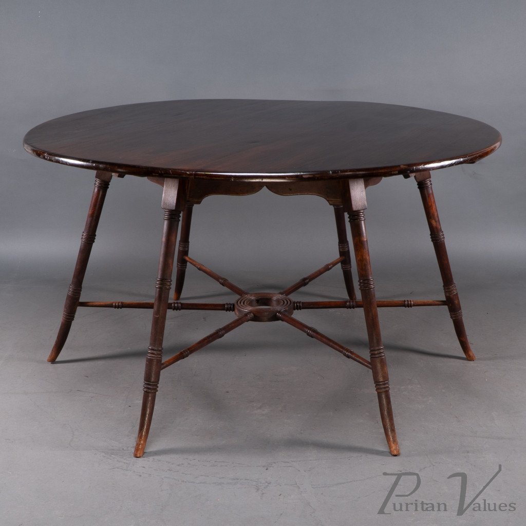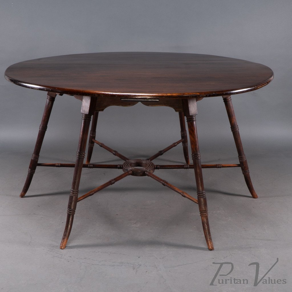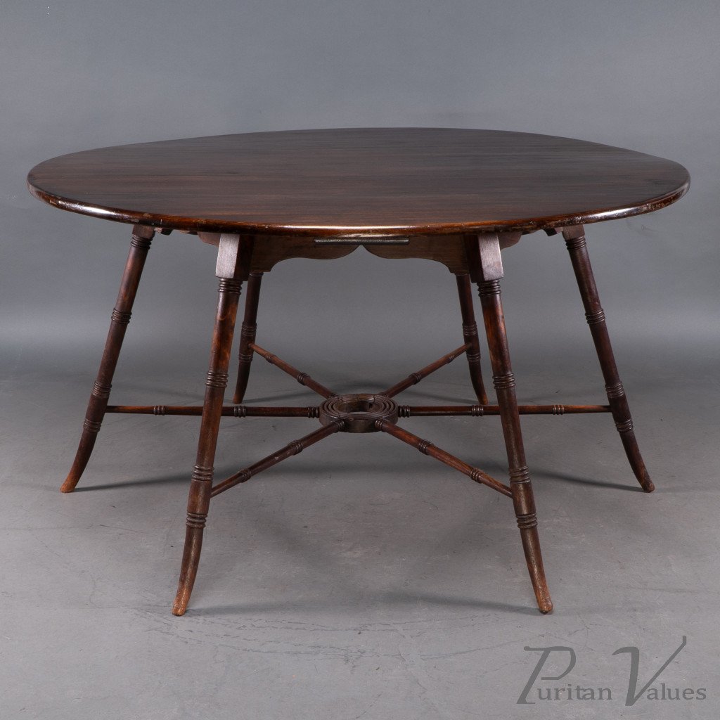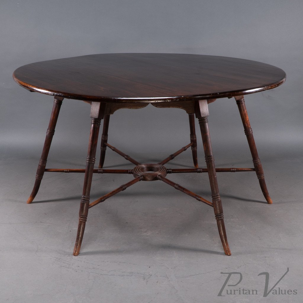 Probably made by Collinson & Lock. An Anglo-Japanese Aesthetic Movement walnut centre or dining table, with a large circular top with a shaped apron below, on six flaring turned legs, united by six radiating spoke stretchers to a central open ring.