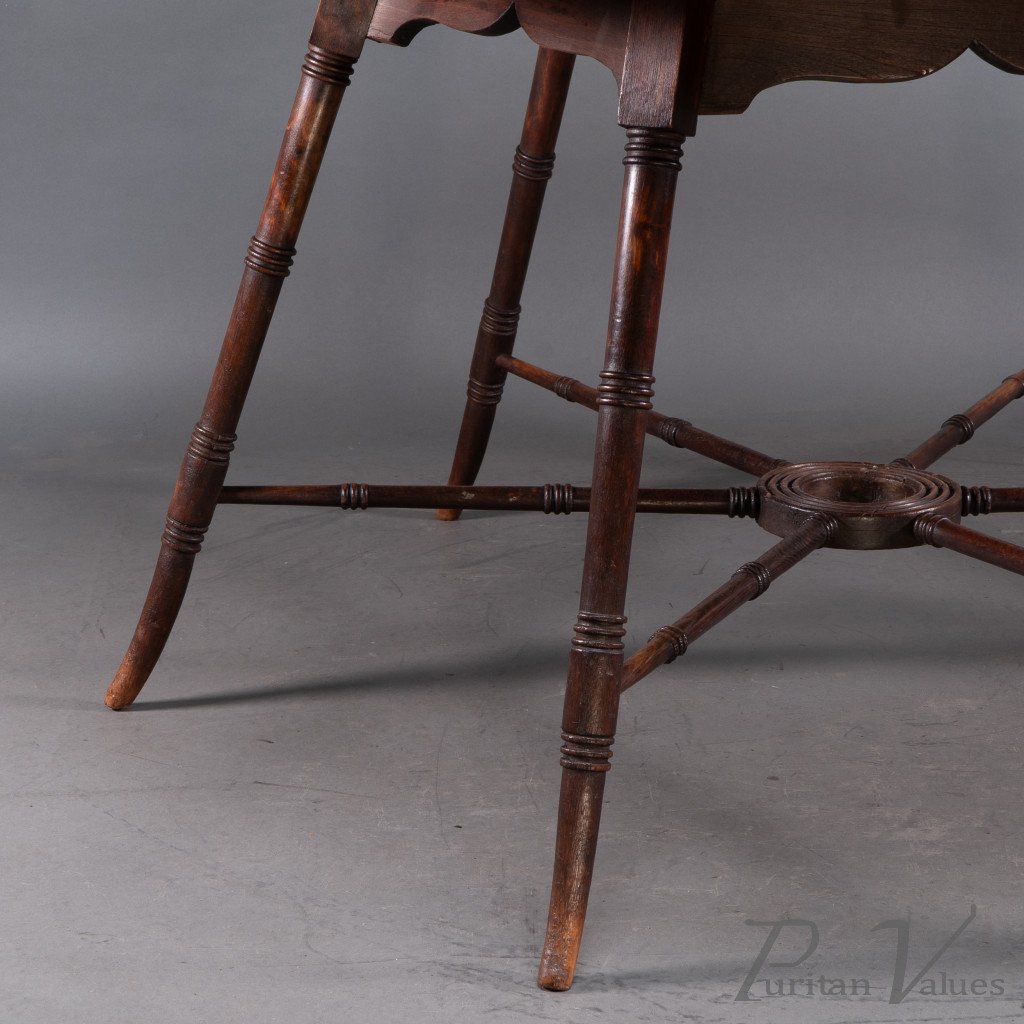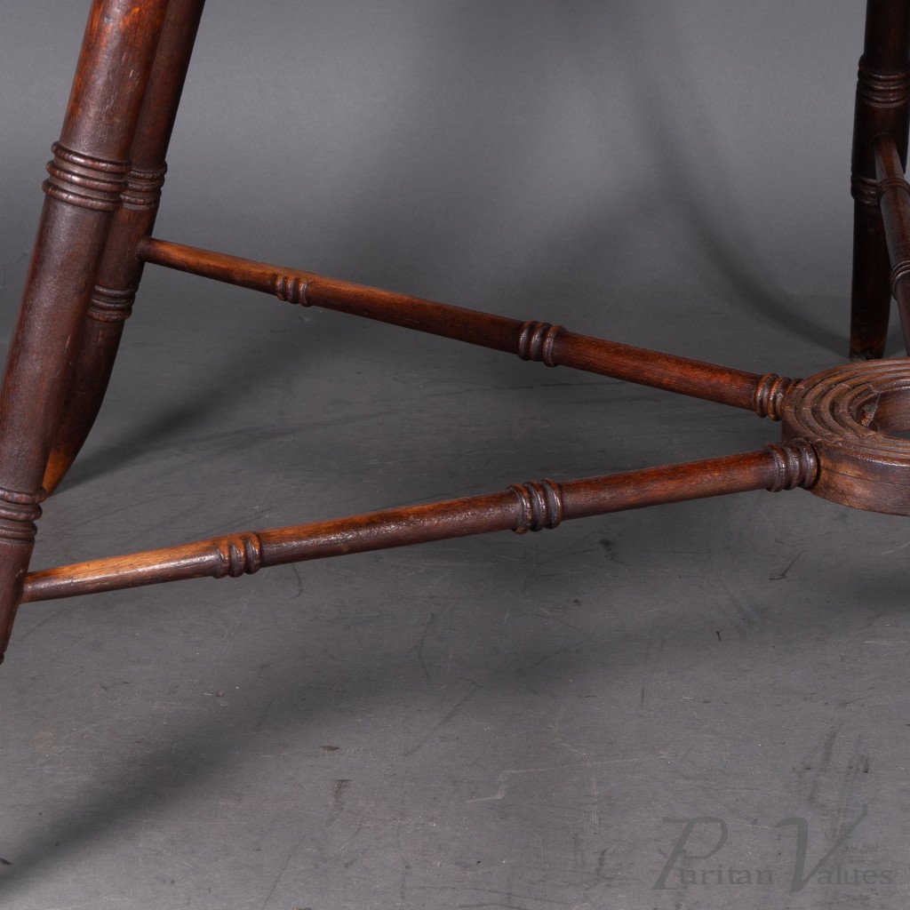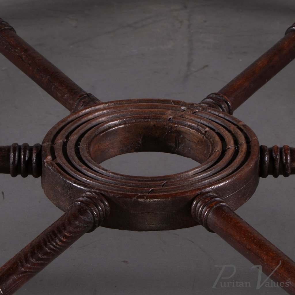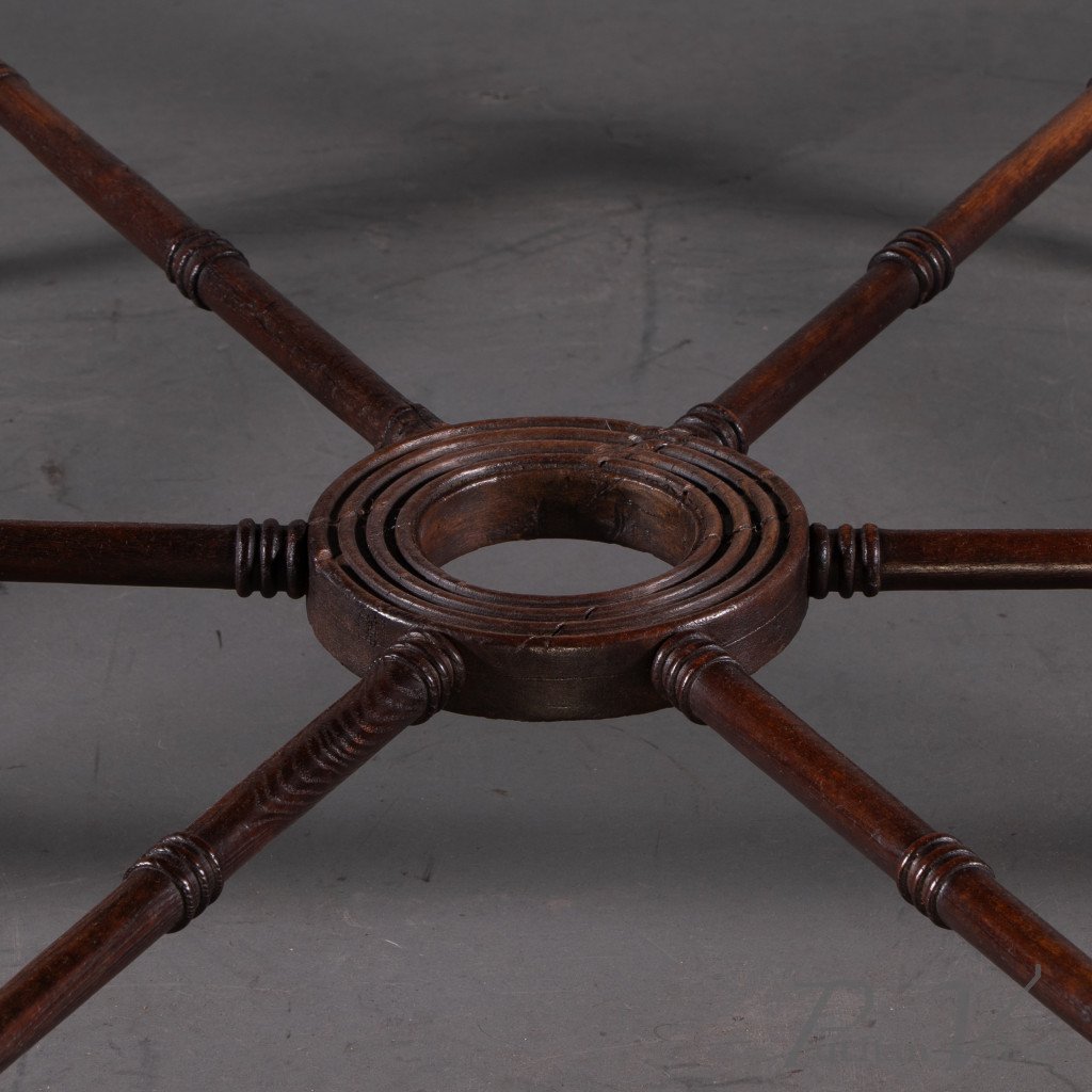 Probably made by Collinson & Lock. An Anglo-Japanese Aesthetic Movement walnut centre or dining table, with a large circular top with a shaped apron below, on six flaring turned legs, united by six radiating spoke stretchers to a central open ring.
