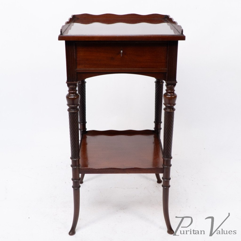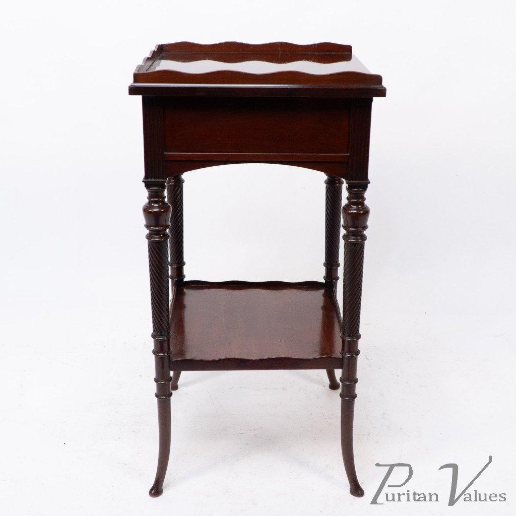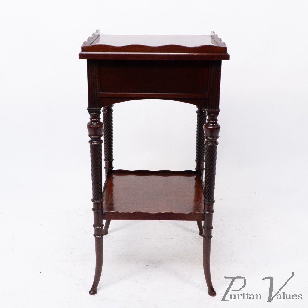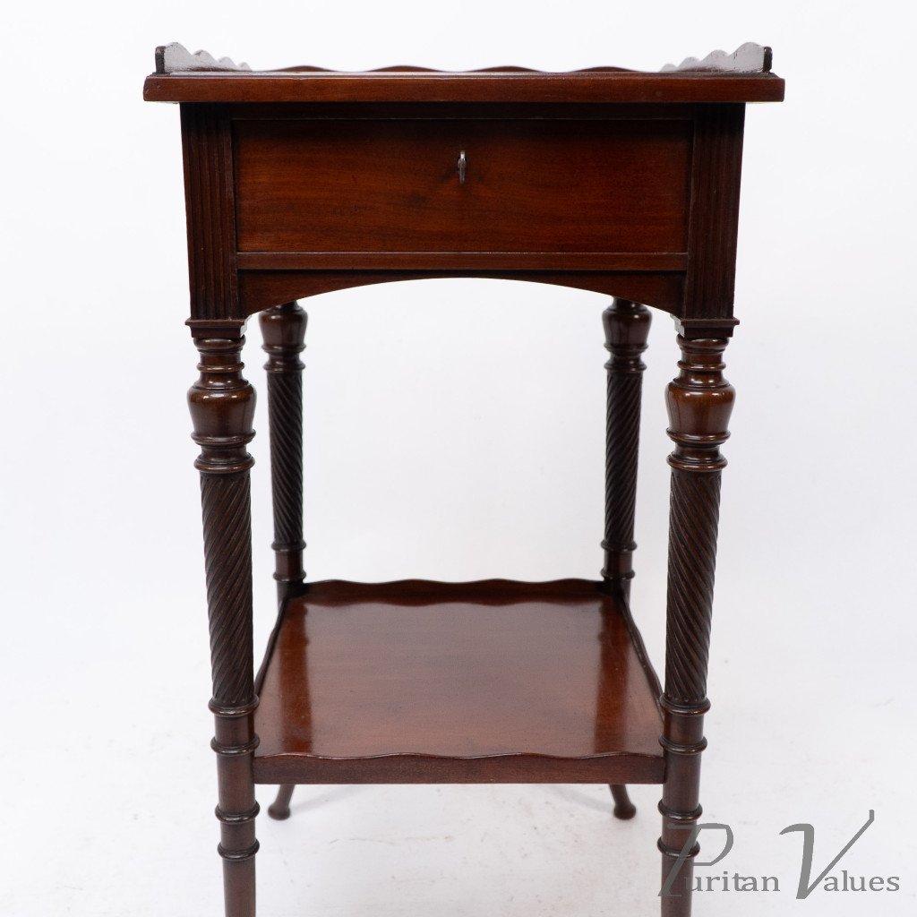 An Aesthetic movement mahogany side table with spiral-turned legs on out swept feet. With the original lock and key to the drawer.