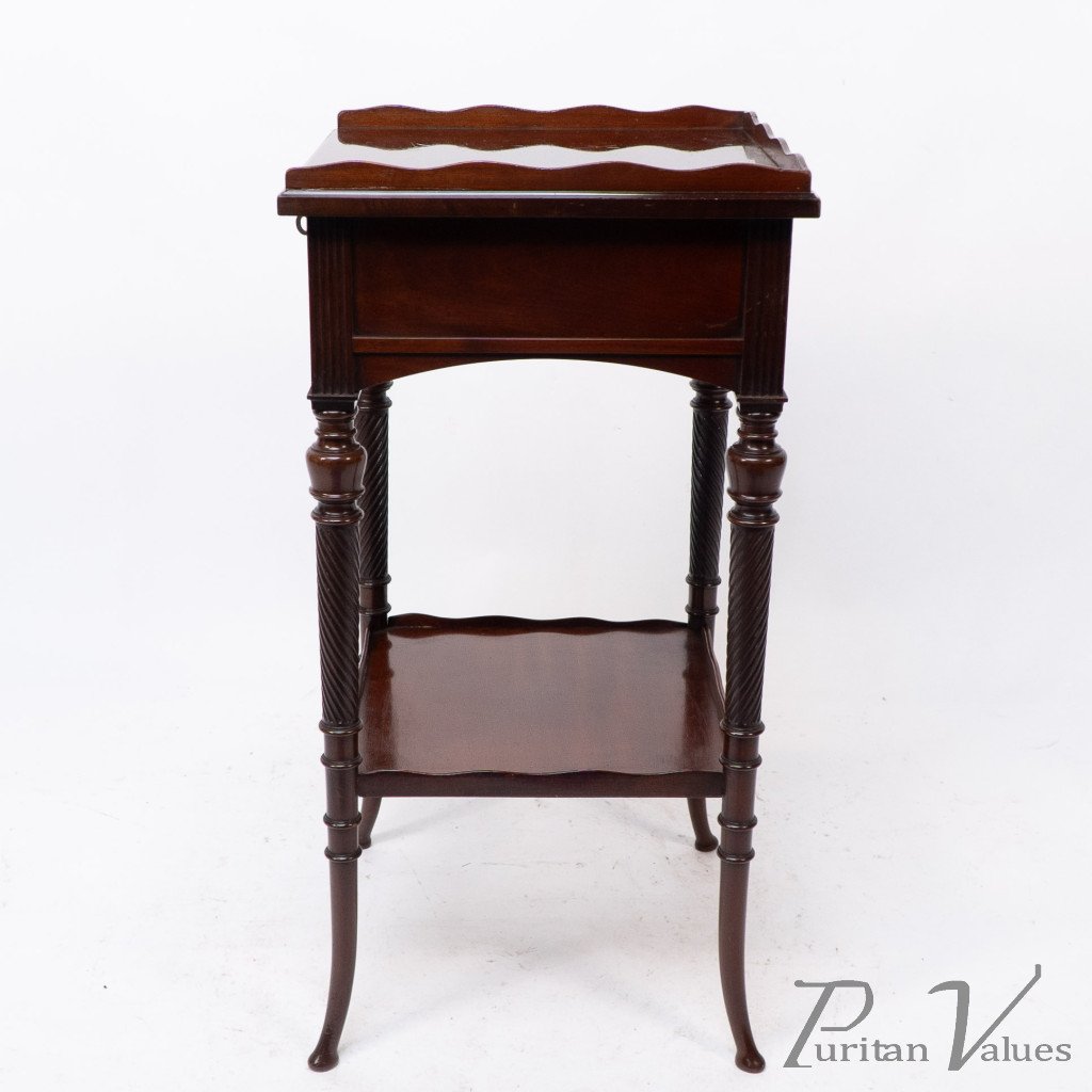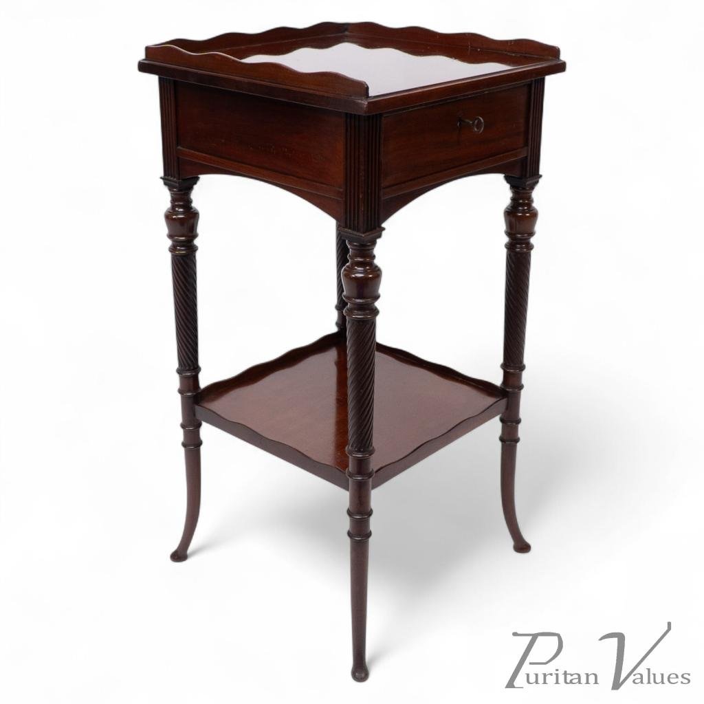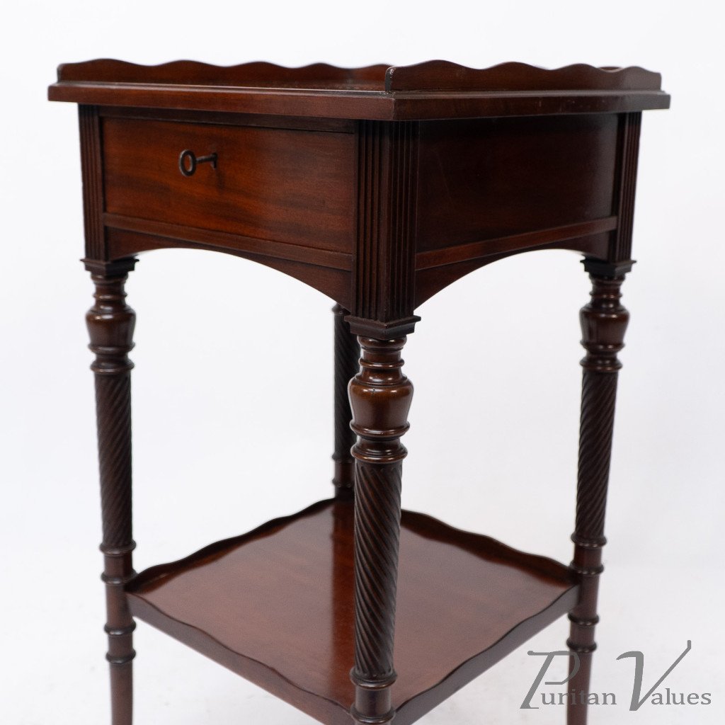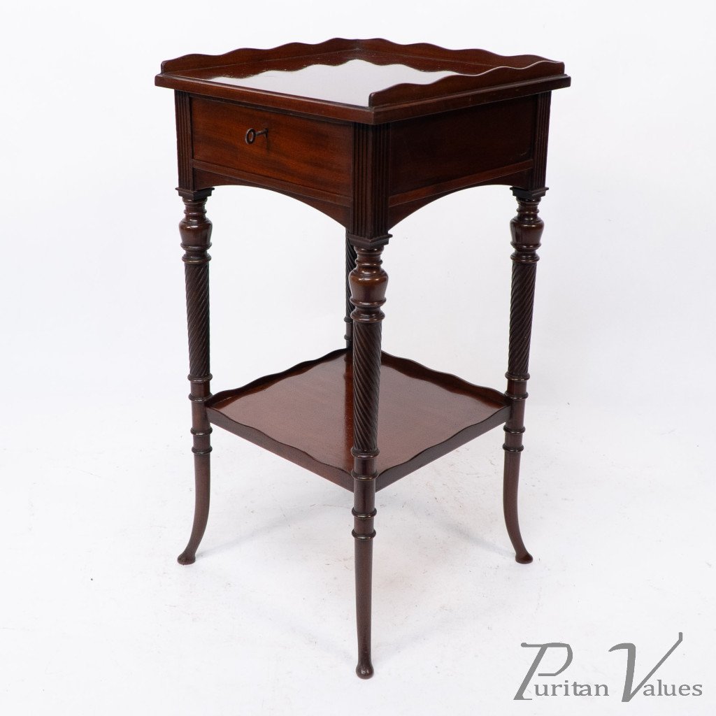 An Aesthetic movement mahogany side table with spiral-turned legs on out swept feet. With the original lock and key to the drawer.