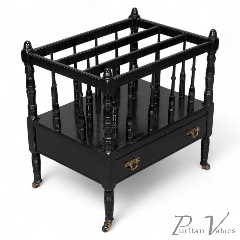 With elongated turned uprights that make up the dividers for magazines, it stood on turned and incised legs with the original brass and ceramic castors.