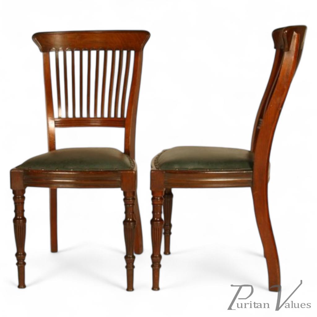 E W Godwin, James Peddle. A well designed pair of dining chairs, with slatted shaped back, each slat dowelled at the top with two dowels to each main back support, on turned and fluted front legs. Made by James Peddle or Smee. See The Secular Furniture of E W Godwin by Susan Weber Soros page 131. Circa 1881.