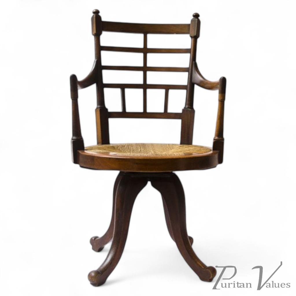 Jacobean or Old English office swivel armchair. Design by E.W.Godwin. probably for William Watt. With it's original drop in rush seat, this type of office chair in the Jacobean or Old English style is very rare and would have probably been made to order. Circa 1870's. SOLD.