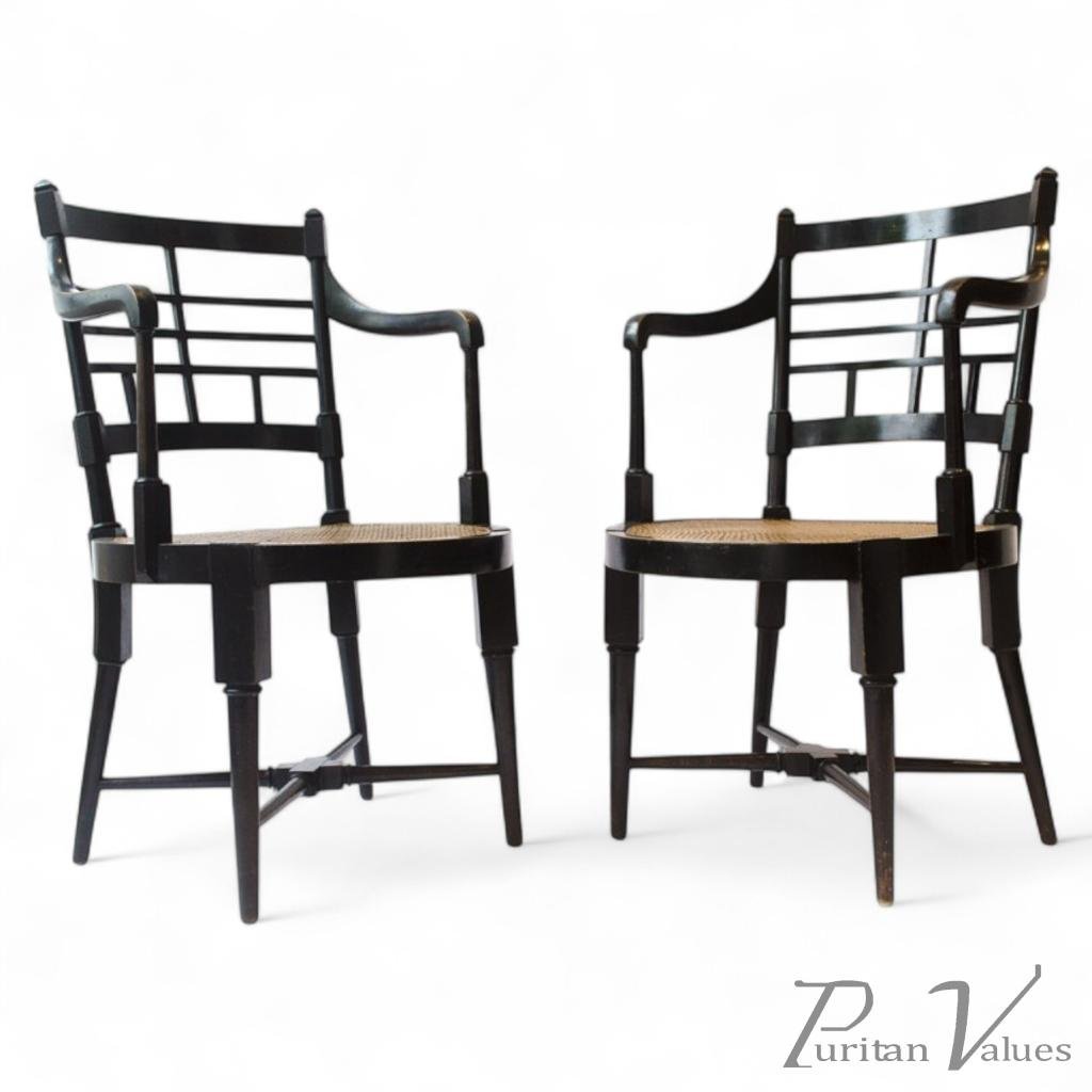 Edward William Godwin (attributed) for William Watt. A rare pair of Old English or JacobeAn ebonised curved back elbow chair, on tapered supports with X-stretchers. These armchairs were manufactured by William Watt and to Godwin's preferred seating choice 'in cane' which both are in good original condition. Godwin was the first designer to incorporate hygiene within the design of furniture and wrote many articles pertaining to this. In Susan Soros page 53 and 54 headed, 'The Sanitary Approach To Furniture Design' on page 53 it states that ,'This concern for domestic hygiene was a frequent theme in his writings and in an article on the furnishing of his own house in London he asserted that ''cleanliness..I take to be the first consideration in all domestic design.'' Godwin had a phobia for dust and dirt and on page 54 it notes that he designed a great many chairs in numerous styles with cane seats whose flat surfaces would not harbour dust or germs and could easily be cleaned. And goes on to say that, '' In addition, his popular Jacobean or Old English chairs first designed in 1867 had cane seats. See Soros, Susan Weber ‘The Secular Furniture of E.W. Godwin’ for similar chair with high stretchers. See also Sotheby’s with Paul Reeves ‘The Best of British Design from the 19th and 20th Centuries: The Selling Exhibition’, London 14th-20th March 2008, p. 53. Height 86cm. Circa 1867.