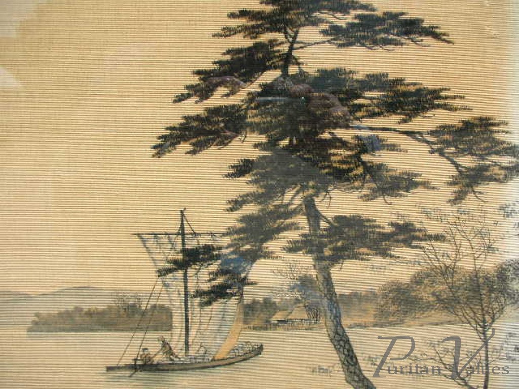 An Anglo-Japanese firescreen Designed by E.W.Godwin. Possibly made by William Watt. With a silk Japanese boating scene. Circa 1870's. Height 32", Width 30", Depth 10 1/2".