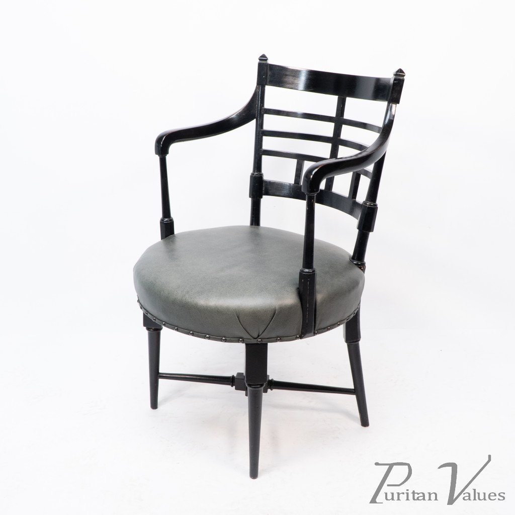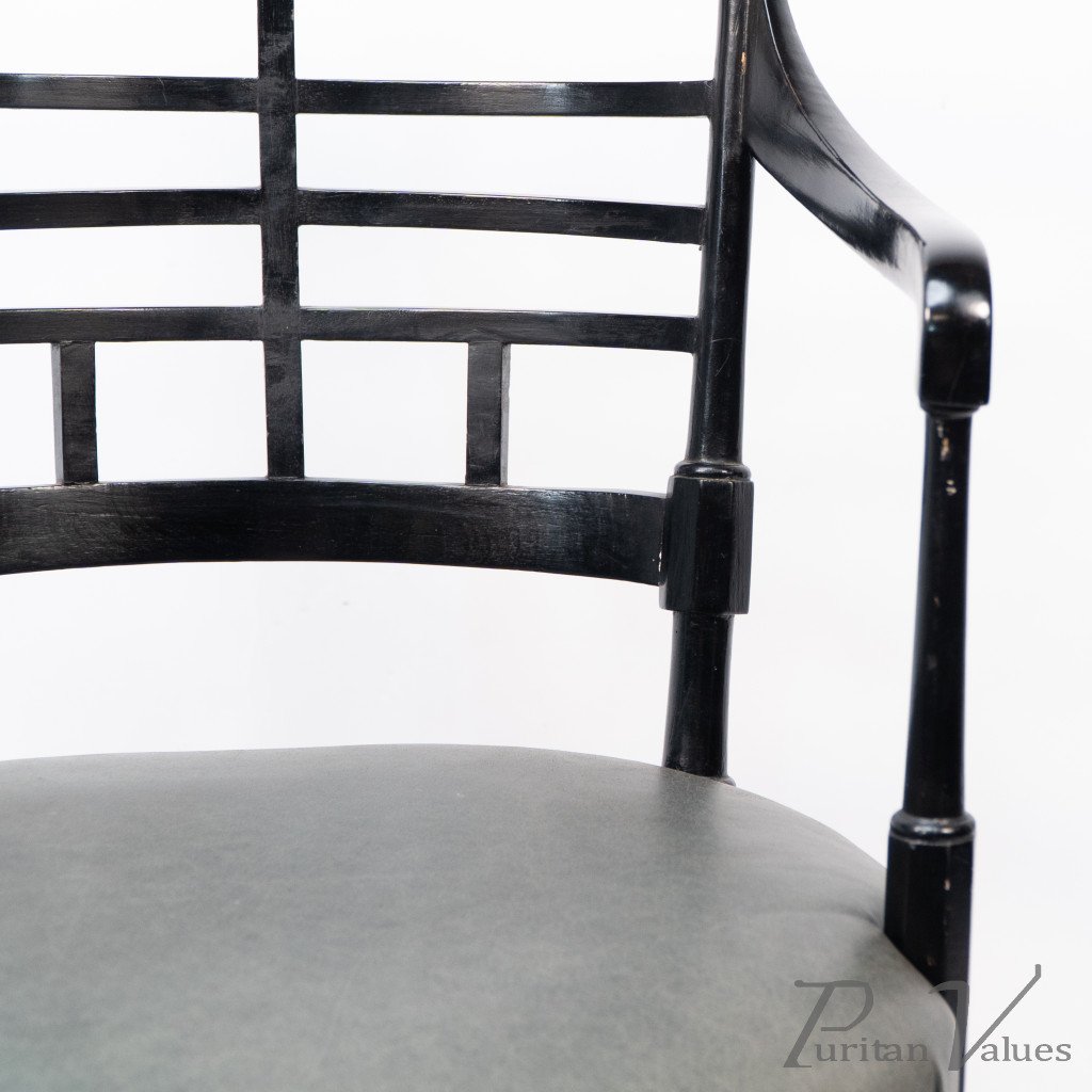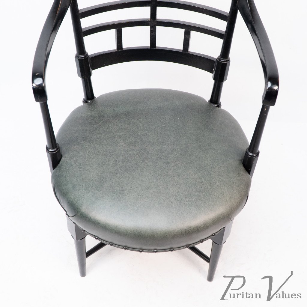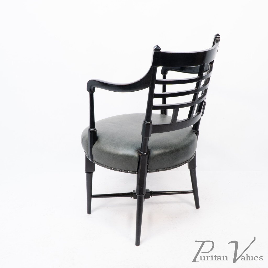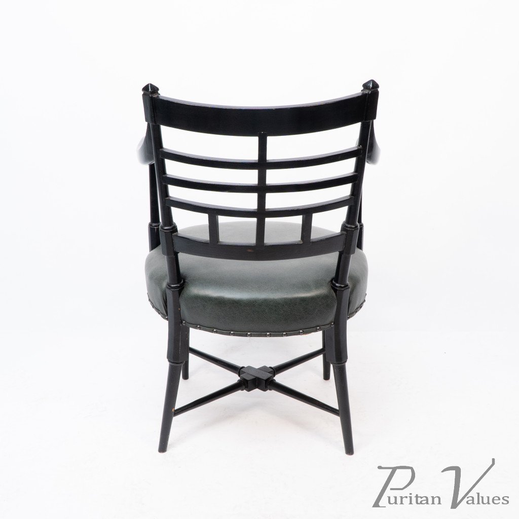 An Anglo-Japanese Old English or Jacobean ebonized armchair. See Susan Webber Soros, The Secular Furniture of E. W. Godwin, Illustration 109 for a cane-seat version. We also have another.