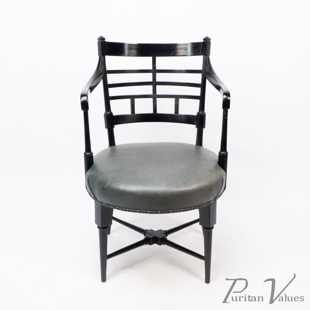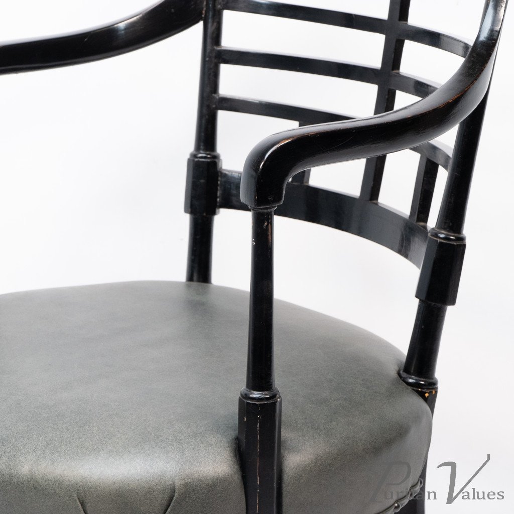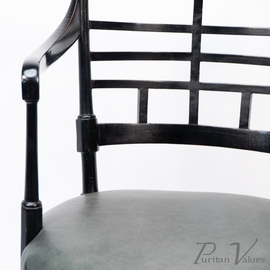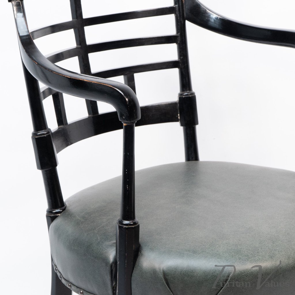 An Anglo-Japanese Old English or Jacobean ebonized armchair. See Susan Webber Soros, The Secular Furniture of E. W. Godwin, Illustration 109 for a cane-seat version. We also have another.