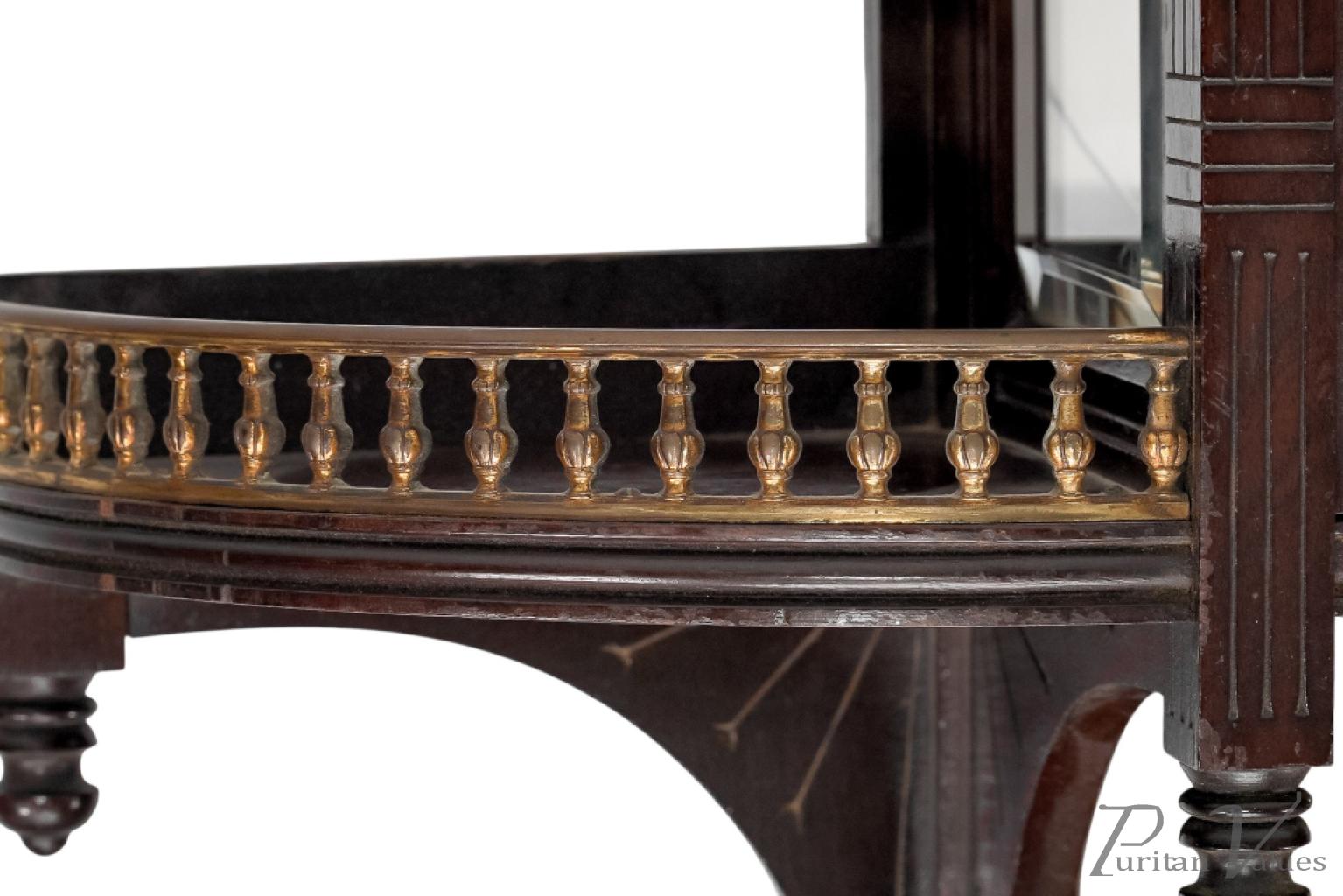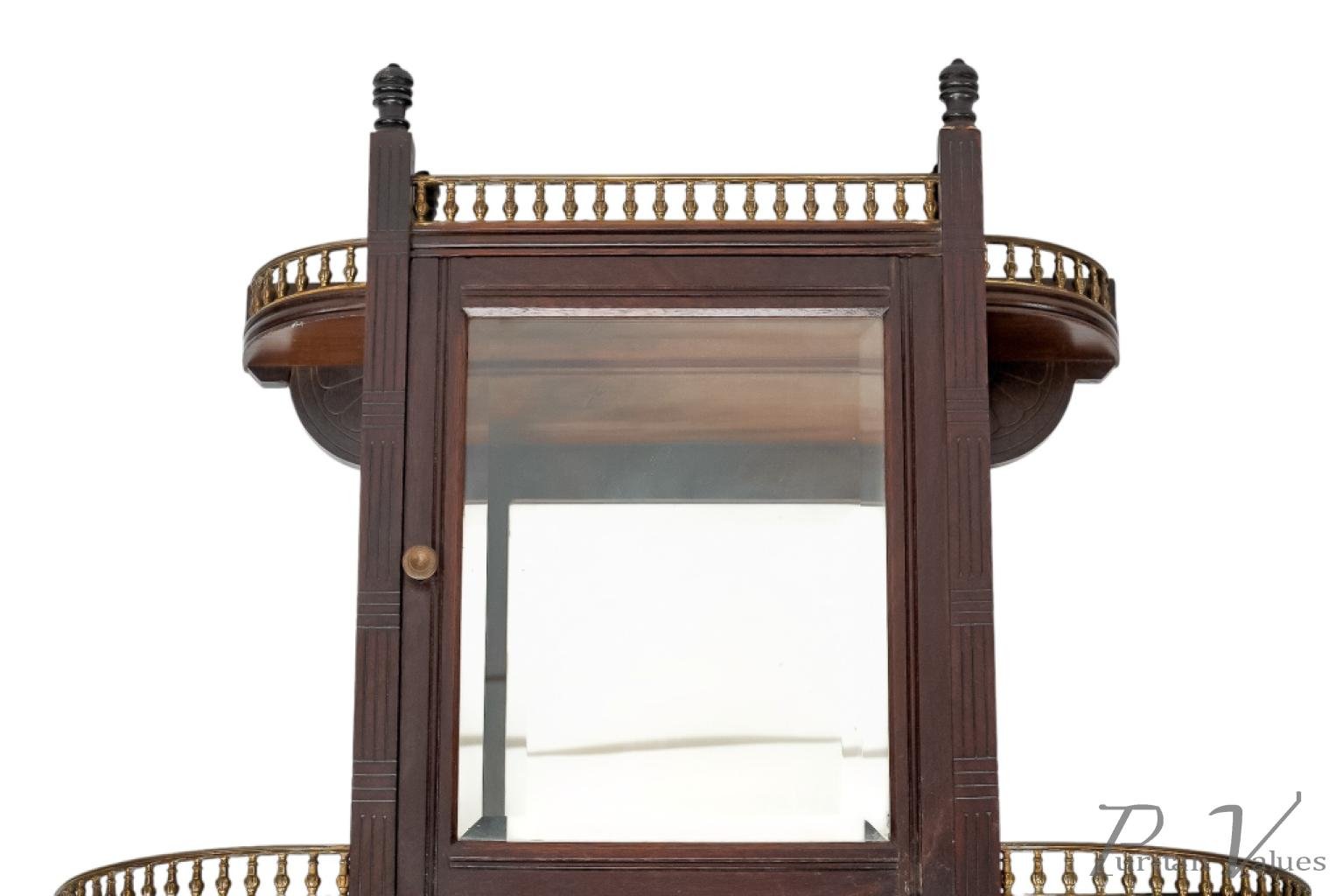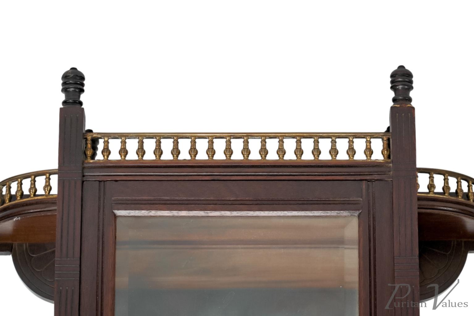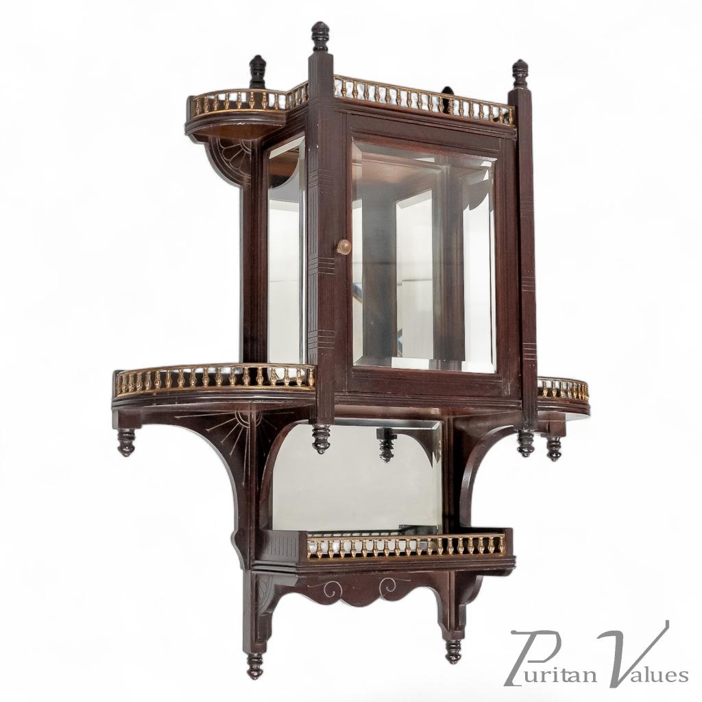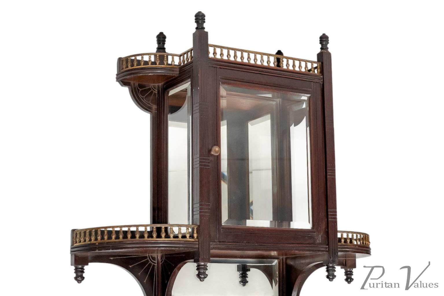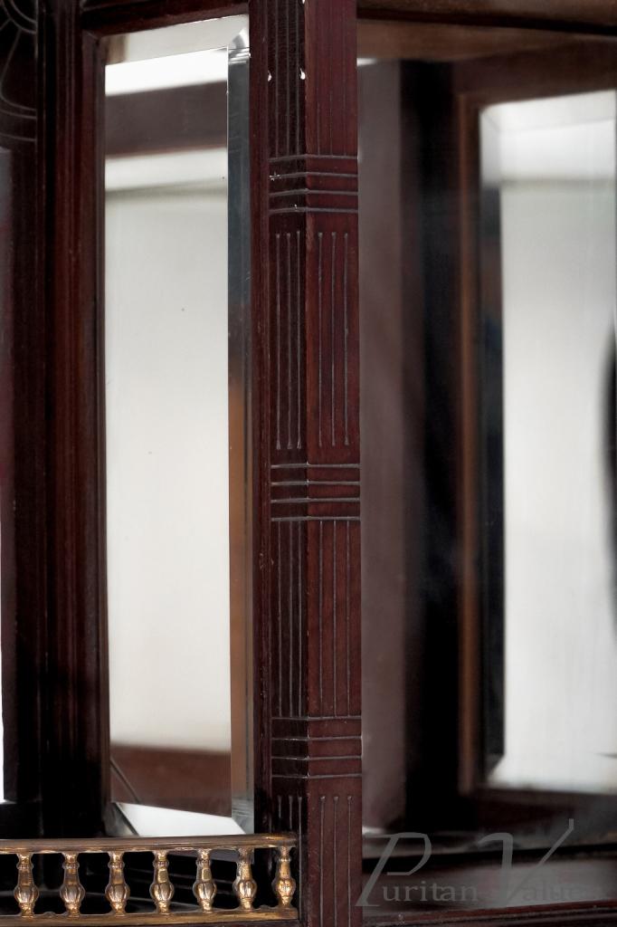 The front has incised vertical and horizontal line details representing Japanese basket weaving, with a glazed door and glazed side to the centre, and a bevelled mirror to the back (there is a small crack to the corner of the mirror). A further mirrored shelf sits below, with a straight brass gallery and scroll decoration to the base.