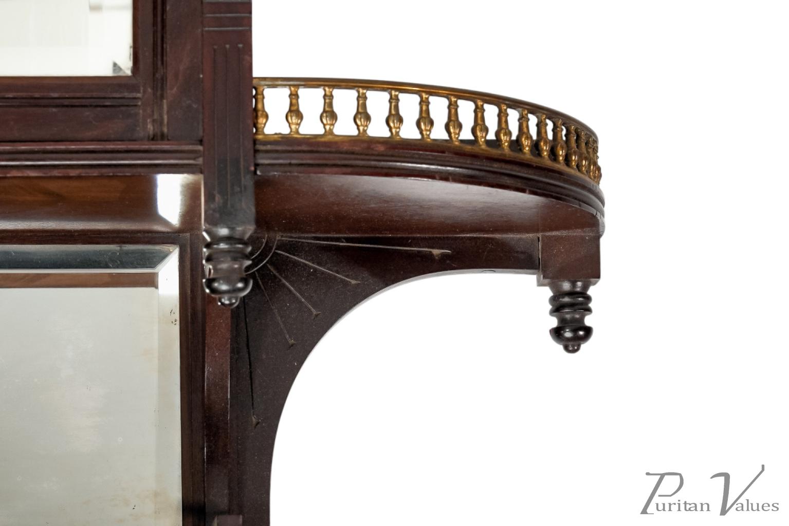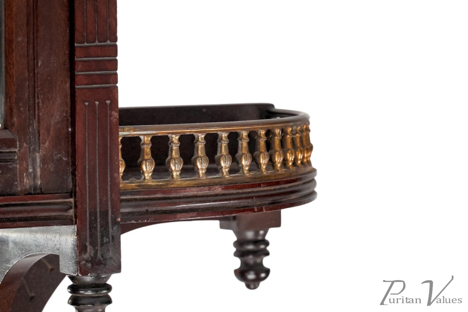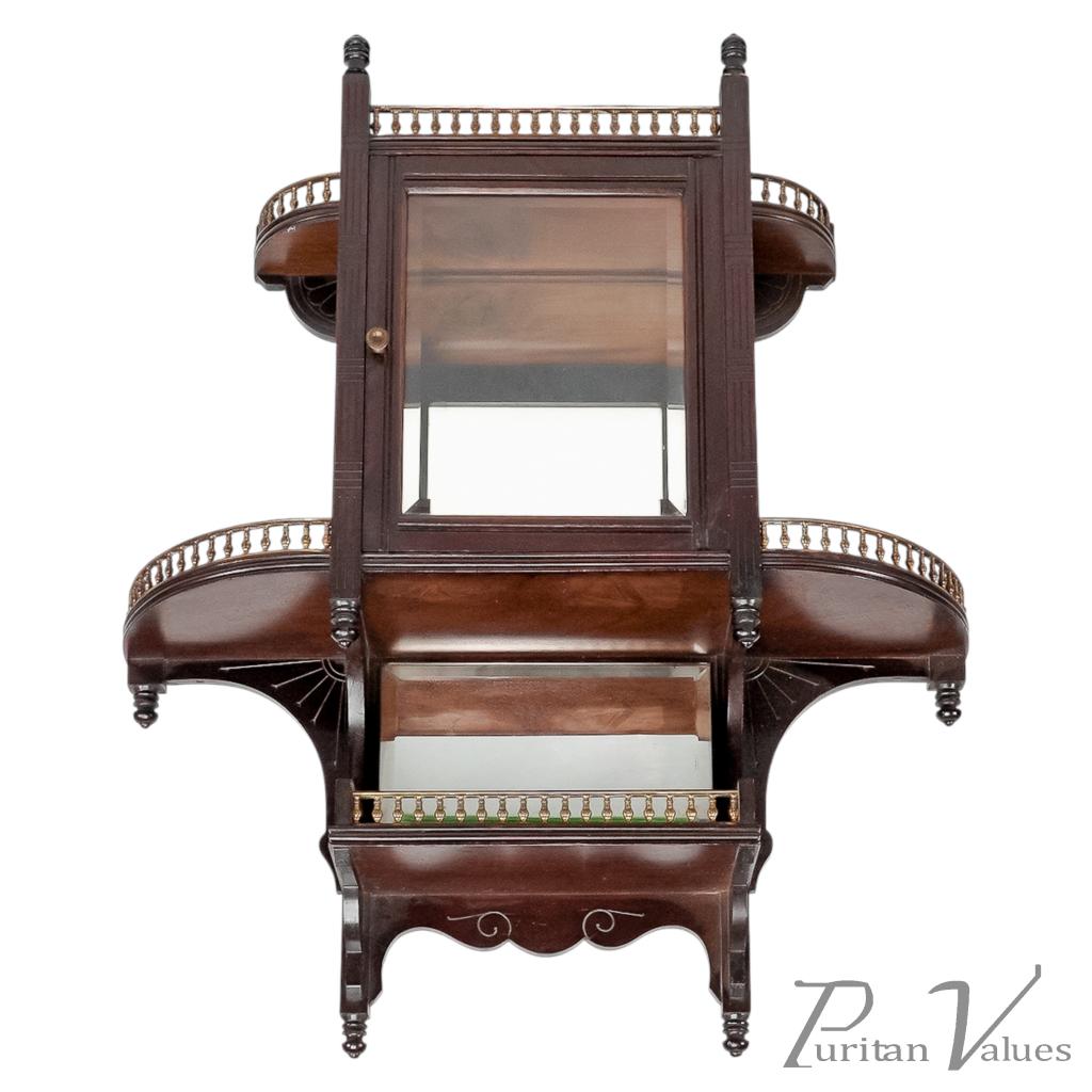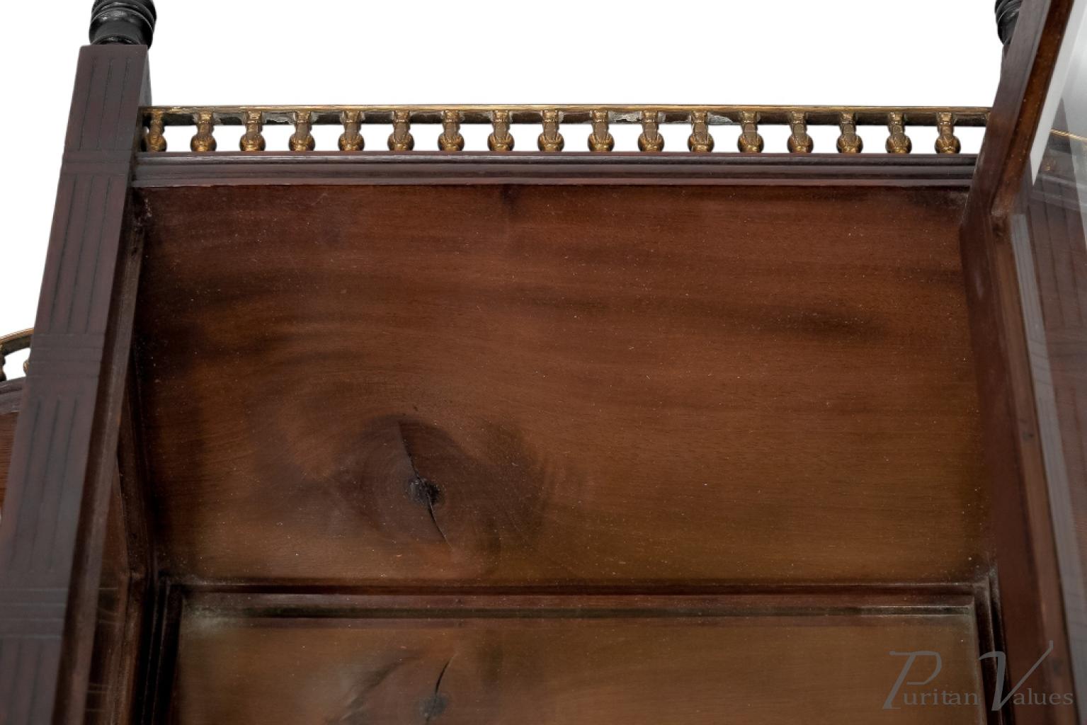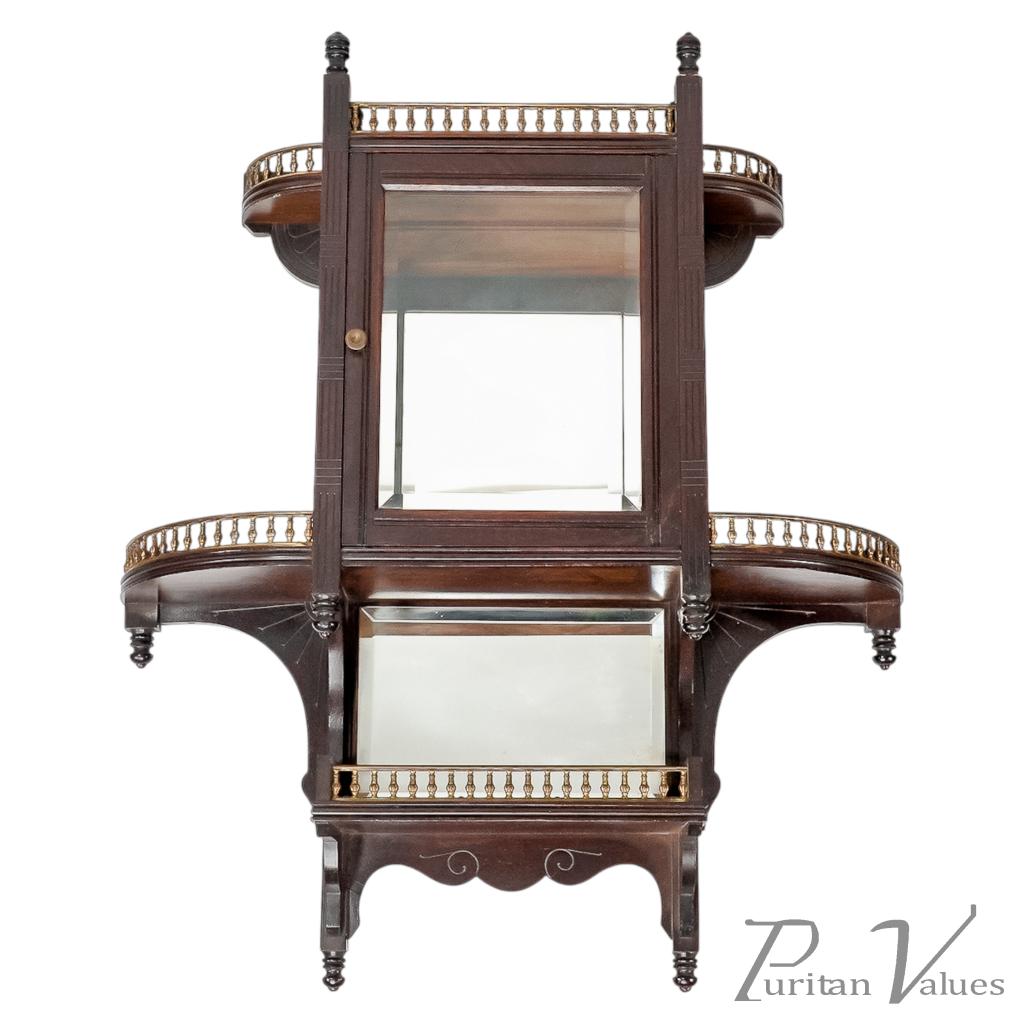 The front has incised vertical and horizontal line details representing Japanese basket weaving, with a glazed door and glazed side to the centre, and a bevelled mirror to the back (there is a small crack to the corner of the mirror). A further mirrored shelf sits below, with a straight brass gallery and scroll decoration to the base.