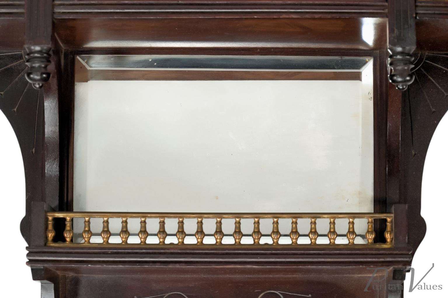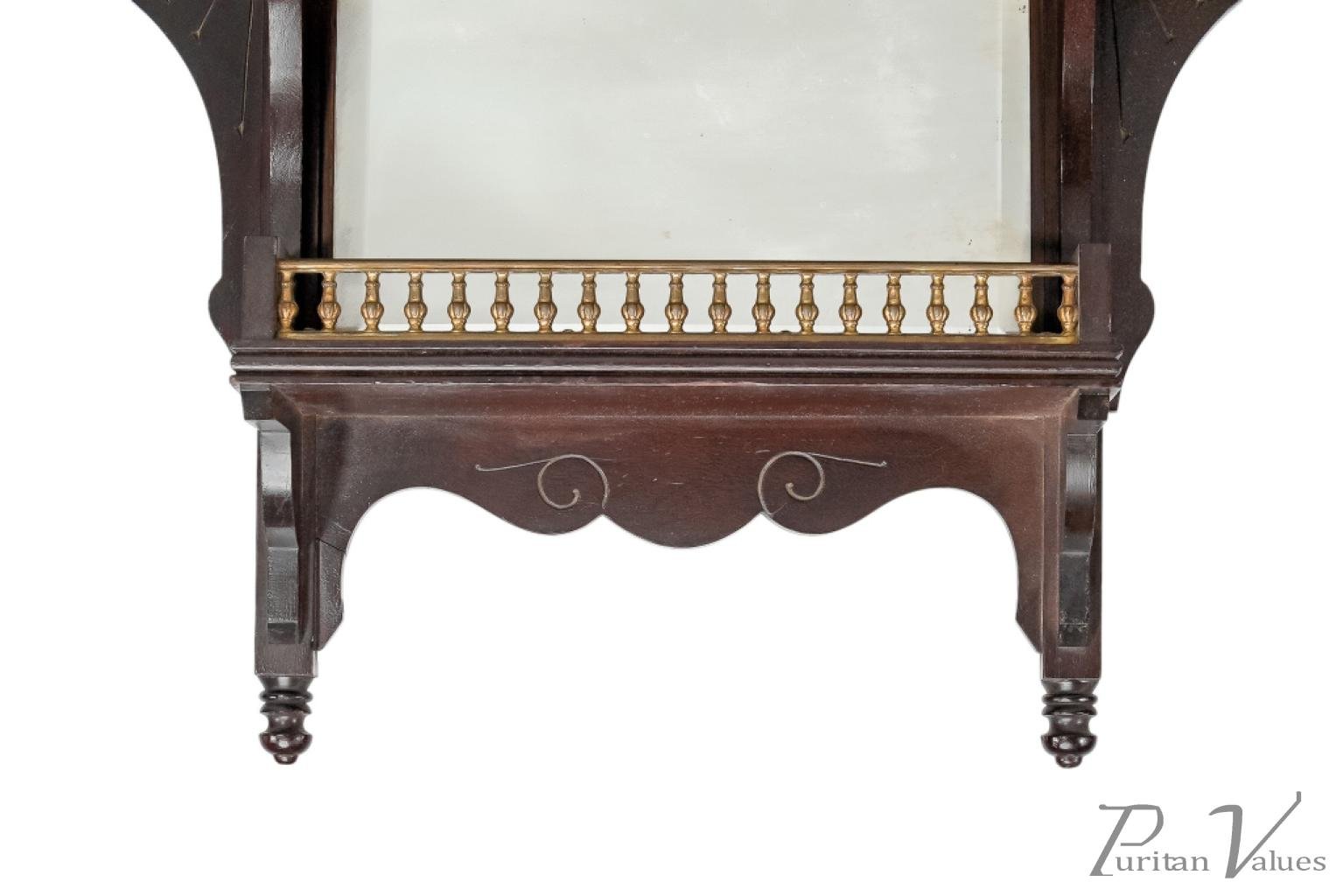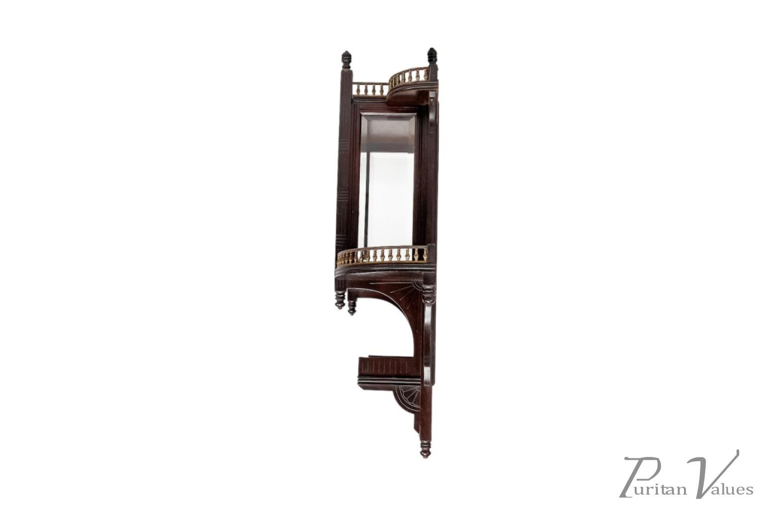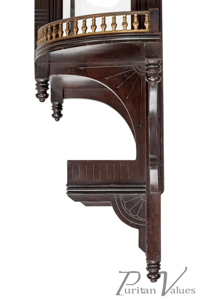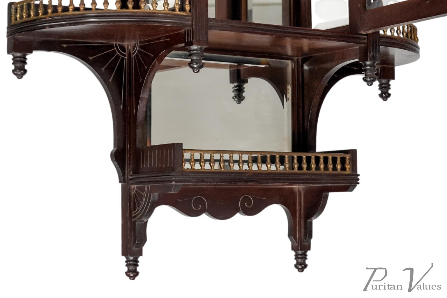 An Aesthetic Movement Japonesque walnut wall display shelf in the style of E. W. Godwin, with elongated turned finials and brass galleries around the tops of the upper and larger lower extended sides, which all have incised quarter rosette decoration below the side shelves.