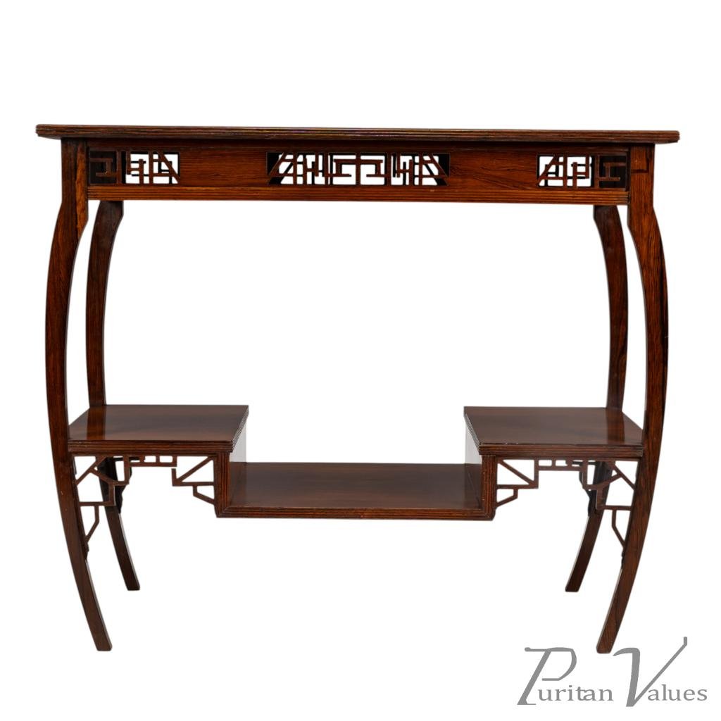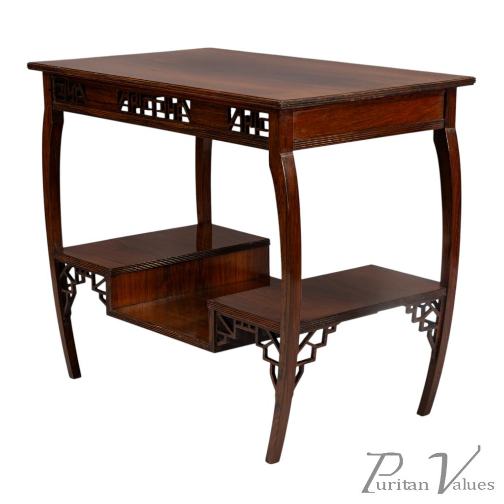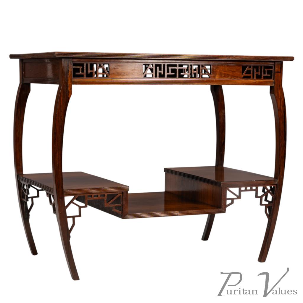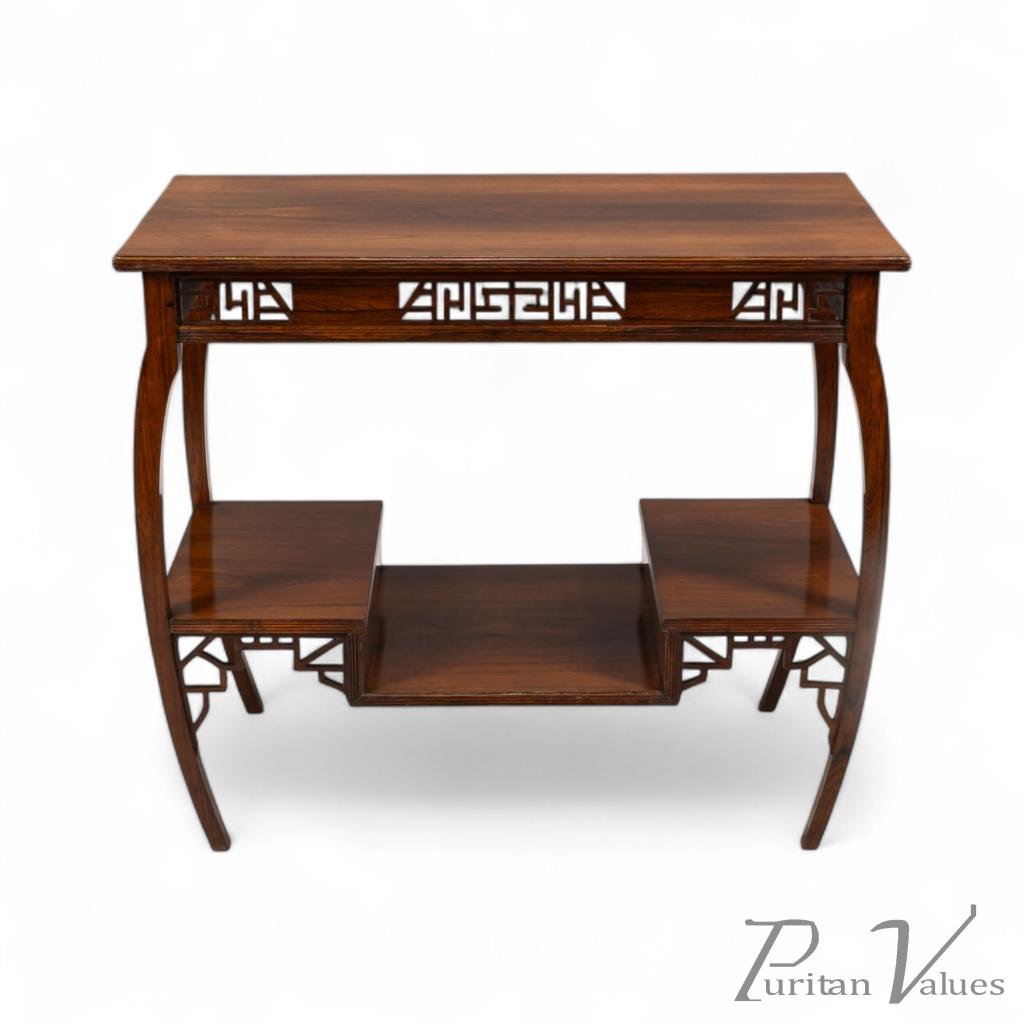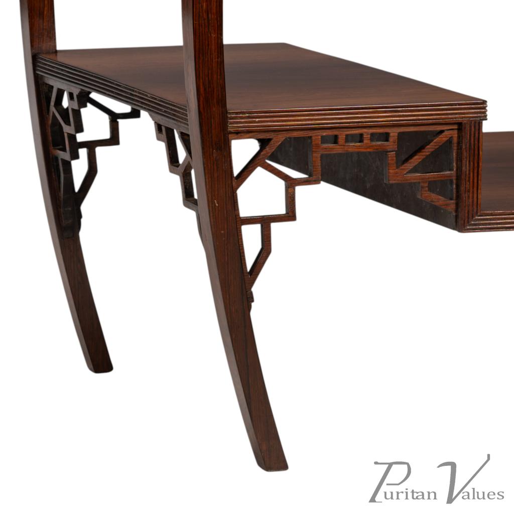 The upper and lower edges feature tram line details above a pair of opposite Japanese fretwork friezes, on four bowed legs cut from solid rosewood. These are united by a lower shelf stepped down in the centre (reminiscent of Godwin's most famous tea table with three hinged side leafs, also incorporating a stepped shelf, designed in 1872, in the collection of the Metropolitan Museum of Art, New York — Susan Soros, Secular Furniture, page 146, fig. 211). He used stepped designs on the lower shelves of all his famous Anglo-Japanese sideboards of the 1870s (Soros, Secular Furniture, pages 176–179, 181–183).