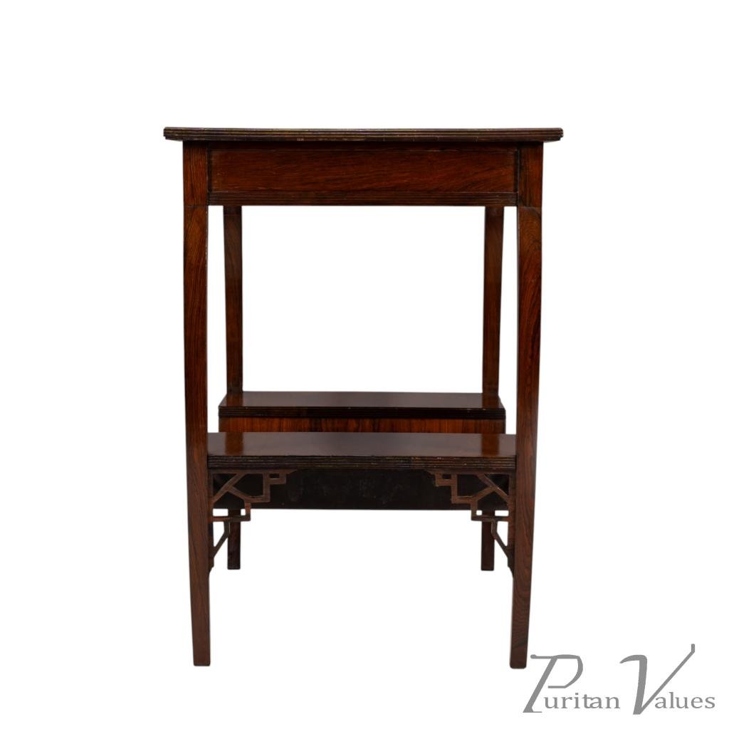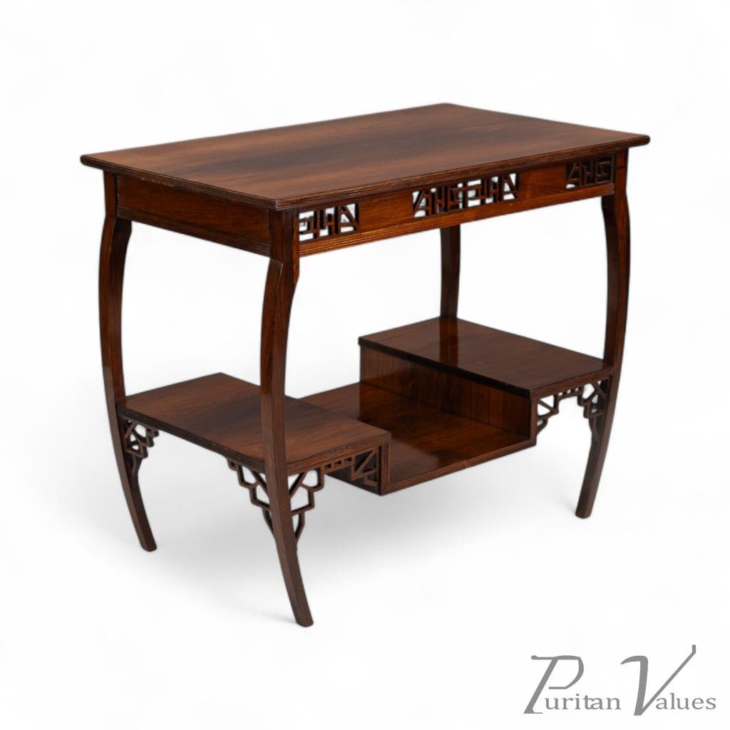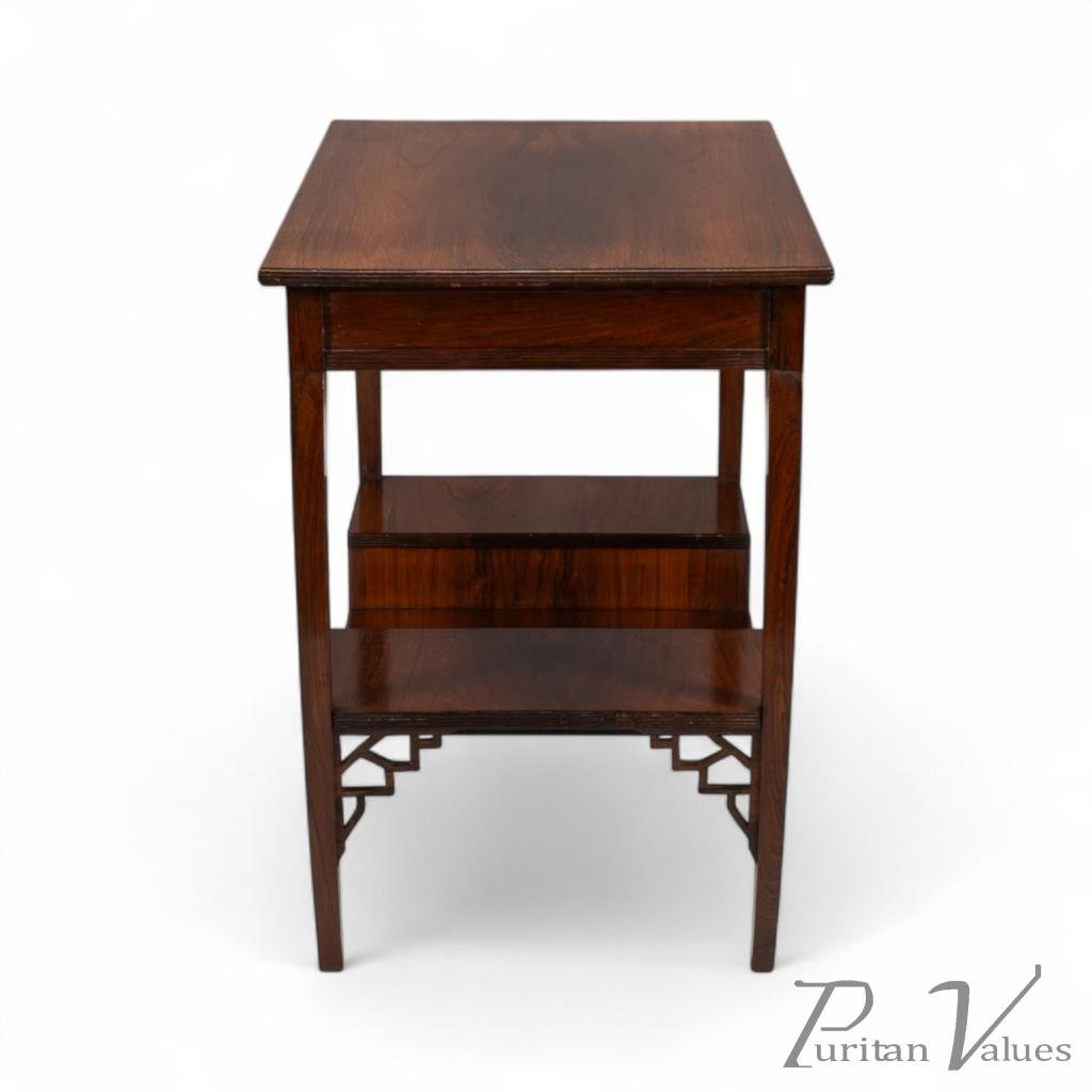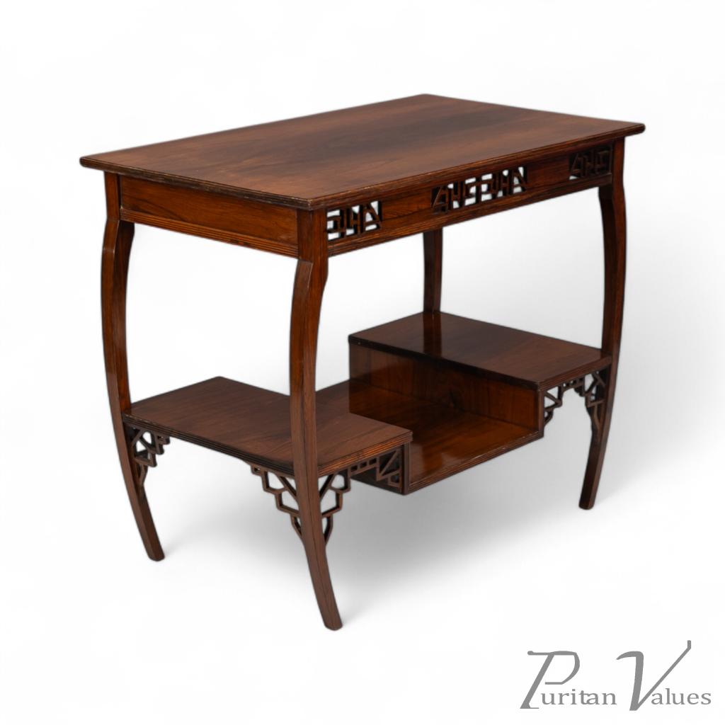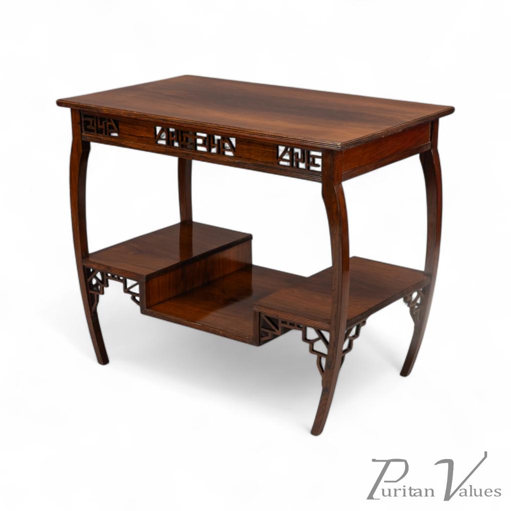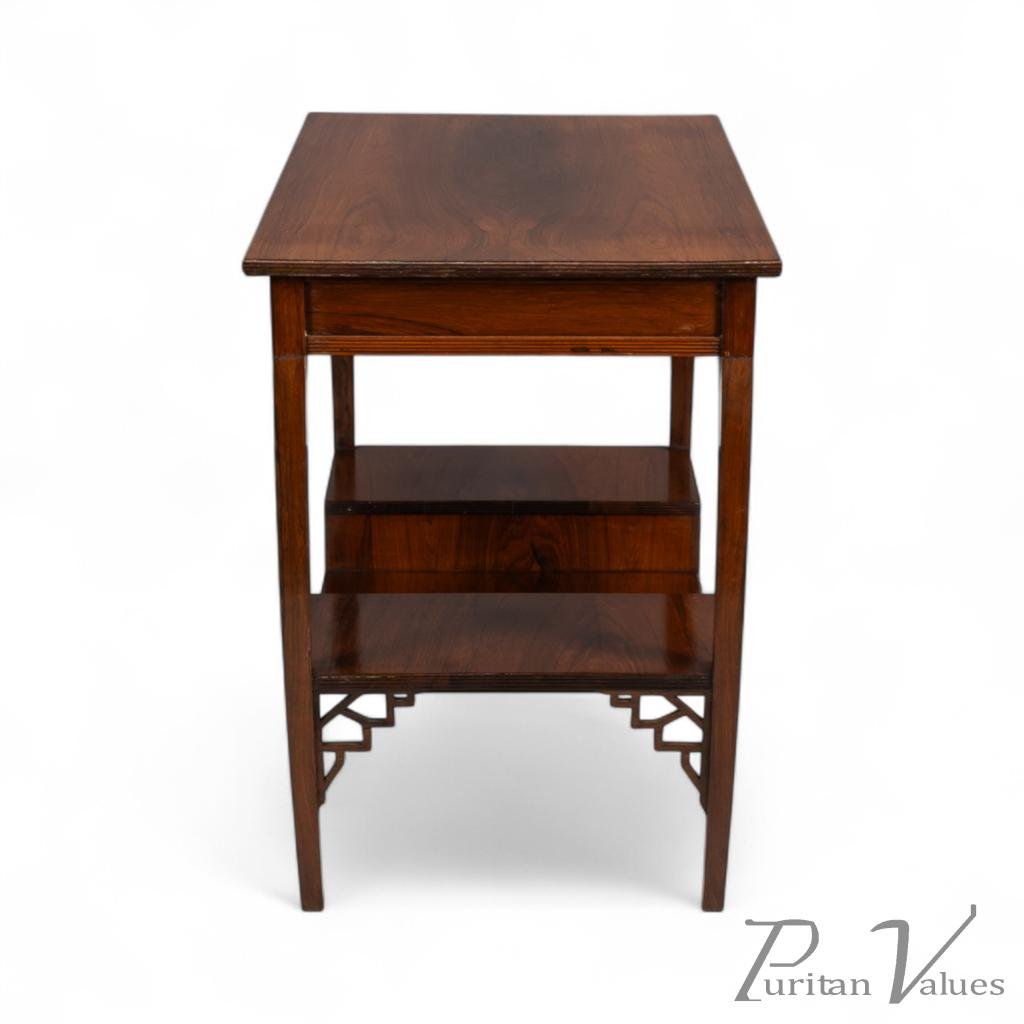 The upper and lower edges feature tram line details above a pair of opposite Japanese fretwork friezes, on four bowed legs cut from solid rosewood. These are united by a lower shelf stepped down in the centre (reminiscent of Godwin's most famous tea table with three hinged side leafs, also incorporating a stepped shelf, designed in 1872, in the collection of the Metropolitan Museum of Art, New York — Susan Soros, Secular Furniture, page 146, fig. 211). He used stepped designs on the lower shelves of all his famous Anglo-Japanese sideboards of the 1870s (Soros, Secular Furniture, pages 176–179, 181–183).