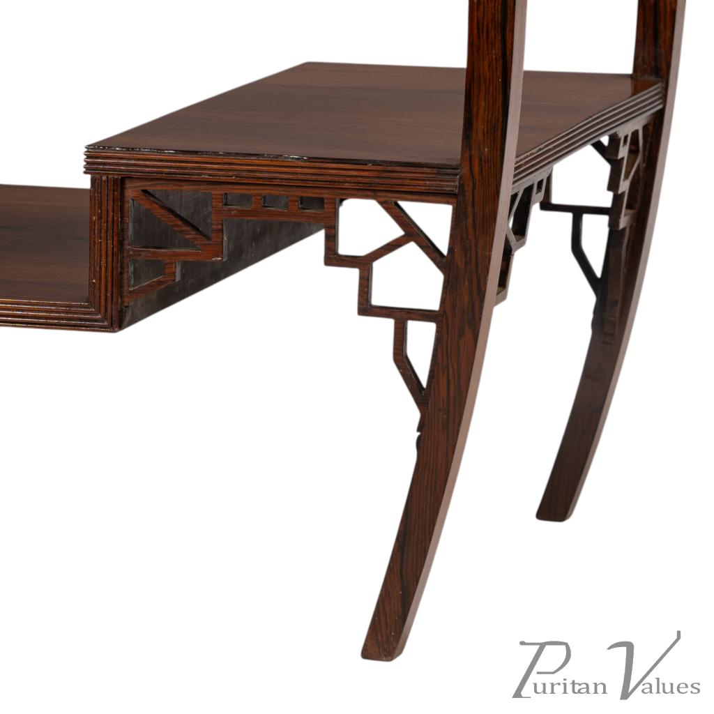 This table shows inspiration from both Japanese and Chinese designs. Chinese hardwood furniture played a crucial role in Godwin’s Anglo-Japanese designs, and he is known to have owned Chinese furniture as well as Chinese accessories (Soros, Secular Furniture, pages 44–48).