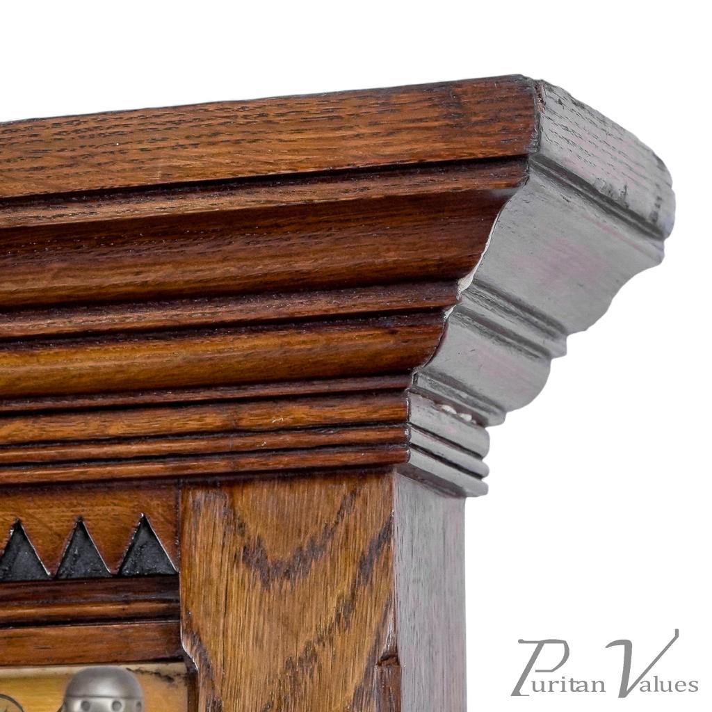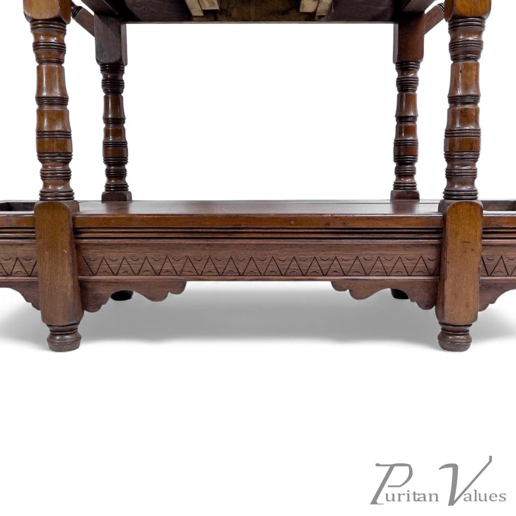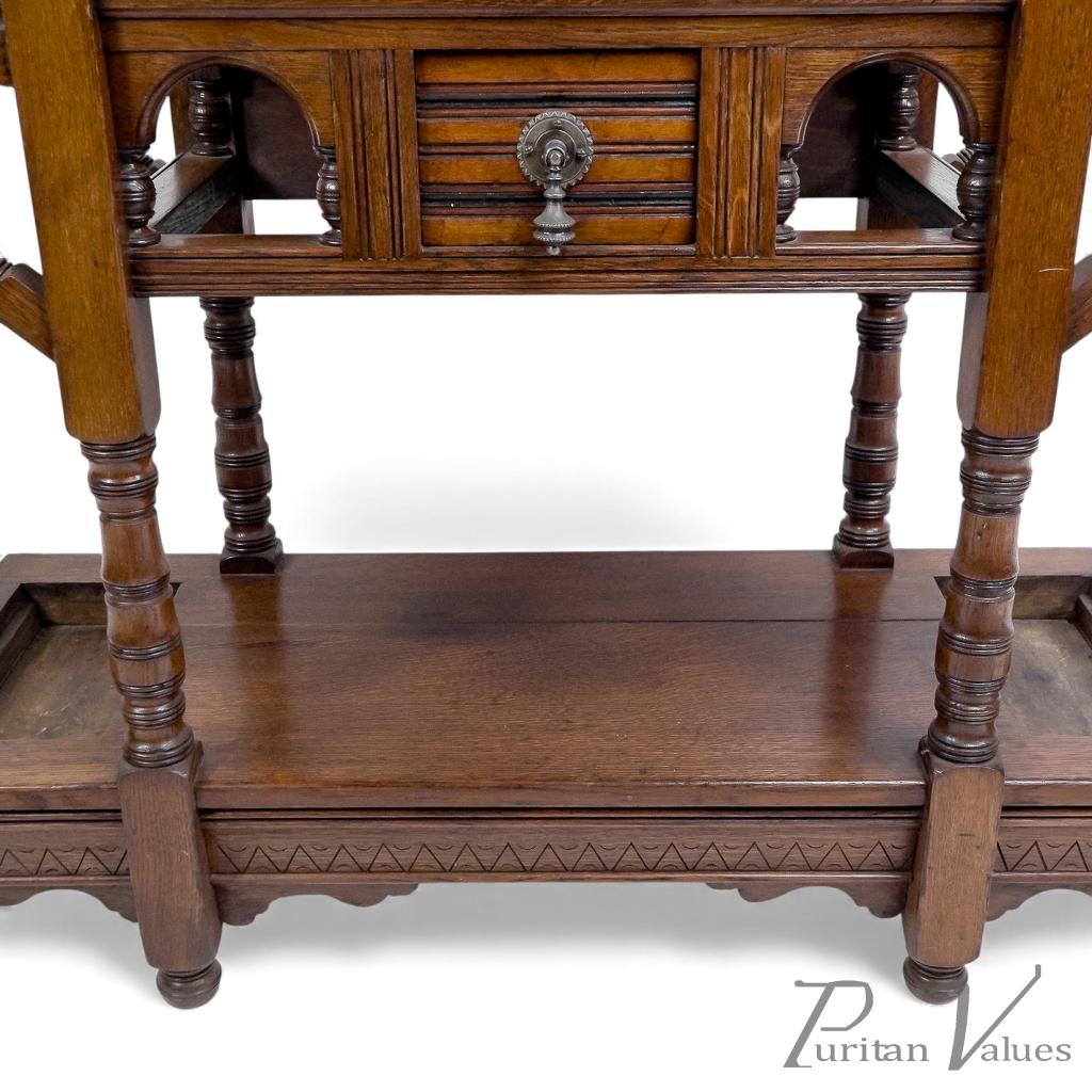 The central drawer features tramline decoration highlighted with ebonized line detail, flanked by arched and half-turned details with turned uprights to the front.