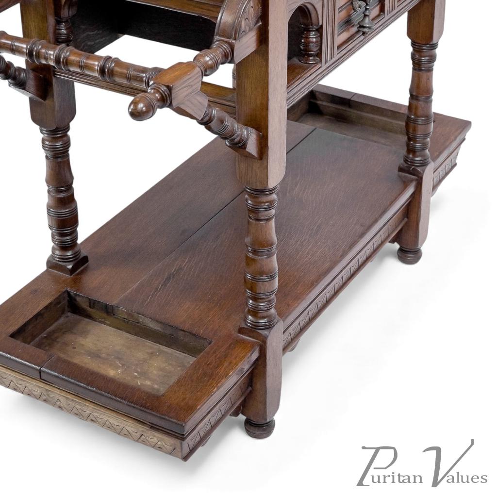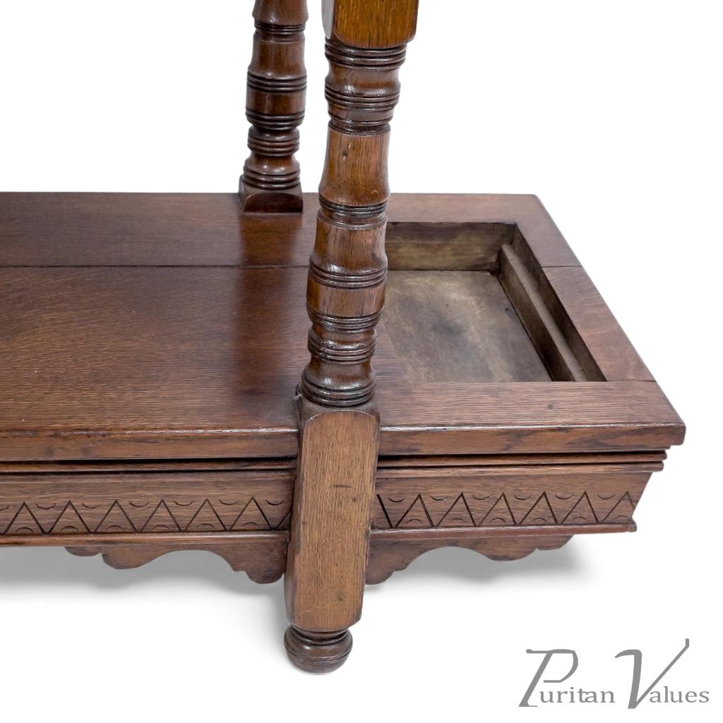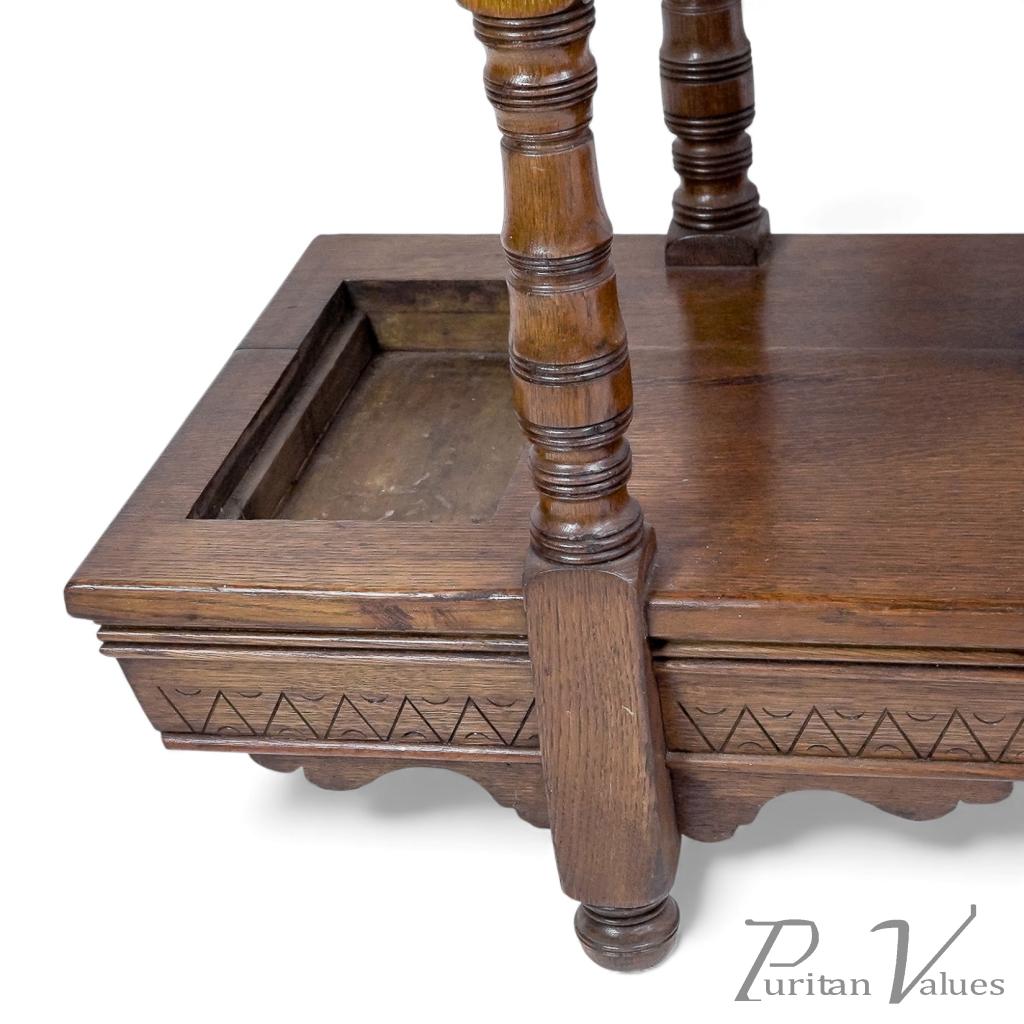 A lower shelf incorporates the drip compartments to each side, with zigzag detailing to the chamfered edges, all stood on turned ball feet with shaped supports to each side.