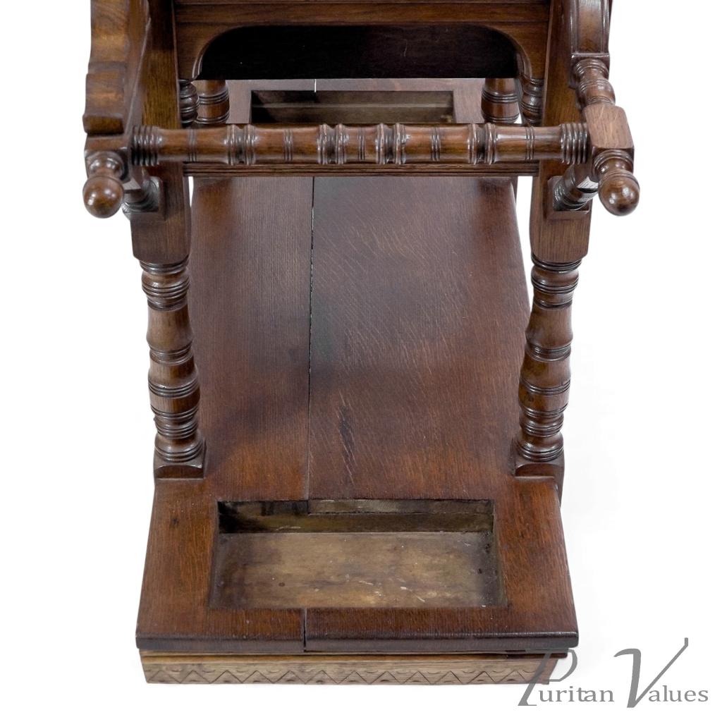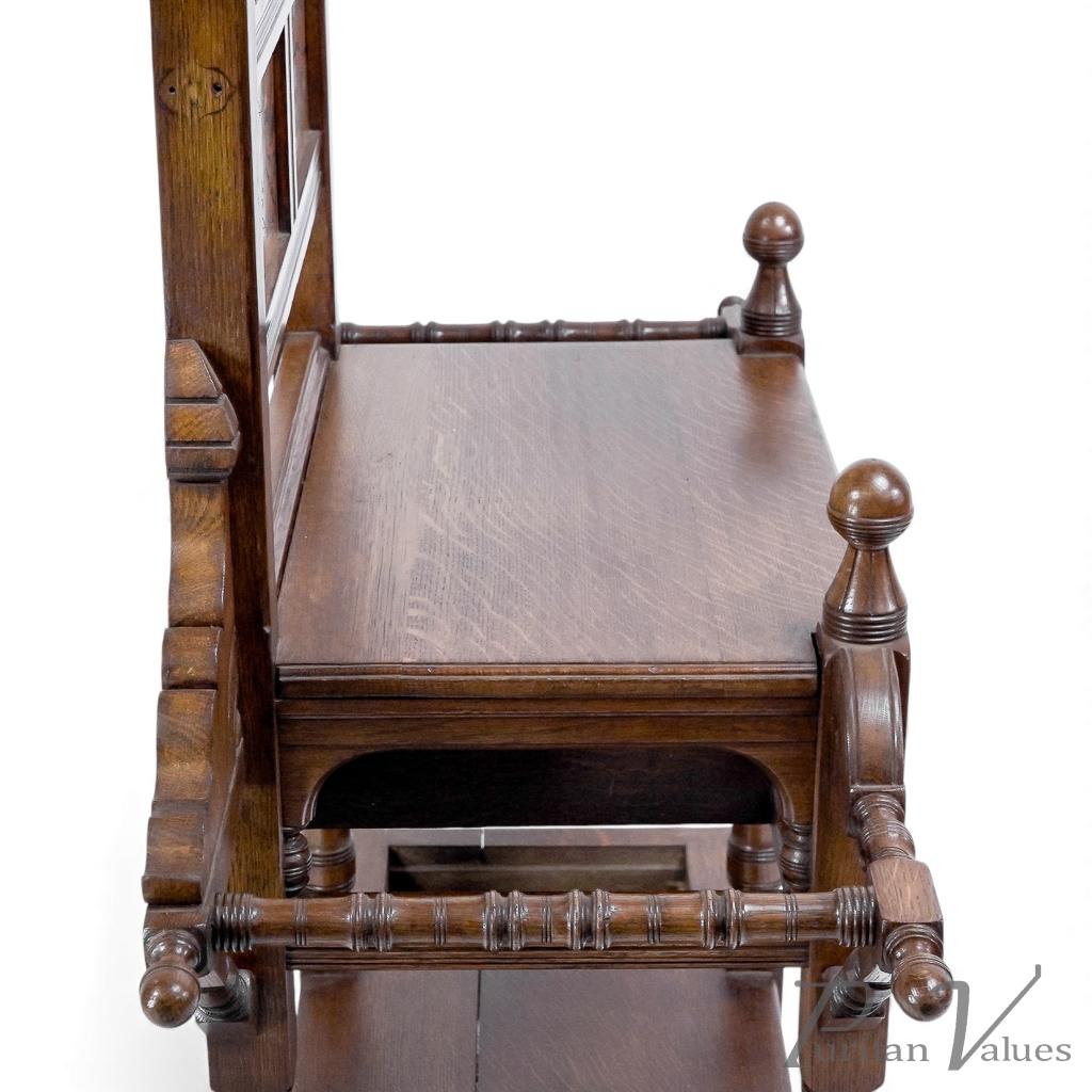 A strong Anglo-Japanese design is incorporated into the umbrella/stick stand compartments to each side, with sunflower carved details to the front and back.