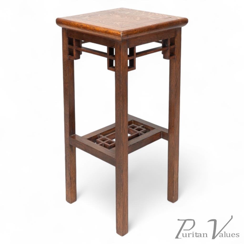 E. W. Godwin Probably Made by William Watt. An Anglo-Japanese Oak & Lattice Statue Stand with Wide Inlaid Top