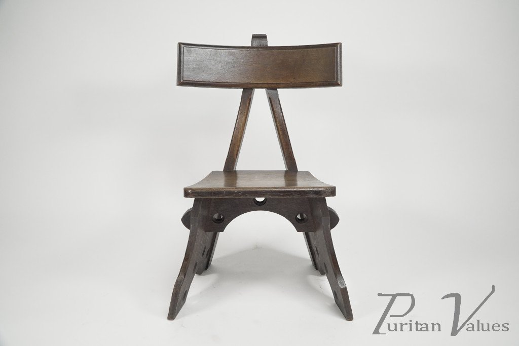 E. Welby Pugin This unique Gothic Revival oak chair design can be found at the Public Record Office, Kew ( BT/43/58, no. 245877). , and is titled 'front elevation of chair quarter real size, ' . The chair was part of the interiors E. W. Pugin designed for the Granville Hotel in Ramsgate. Unfortunately, the hotel's failure in 1873 led to Pugin's bankruptcy. However, by 1876, some of Pugin's designs were available through Cox & Sons church furnishings company, and later designs of E. W. Pugin's furniture were also manufactured by the London cabinet maker C & R Light. Variants of this chair design have been discovered, featuring four holes as in this example, instead of five holes on each side with small rounded brass feet at the front, makers C & R Light or Cox & Sons come to mind. The Metropolitan Museum of Art in New York houses a similar chair, that example has brass feet and four pierced holes on the sides as this example shares. One such chair was previously owned by the painter P. H. Calderon R A who was a British painter of French birth and Spanish ancestry who initially worked in the Pre- Raphaelite style. He was also Keeper of the Royal Academy in London. Three close variants with brass feet are depicted in Jeremy Cooper's book " Victorian and Edwardian Furniture and Interiors. There is an old repair to the back left hand lower side.