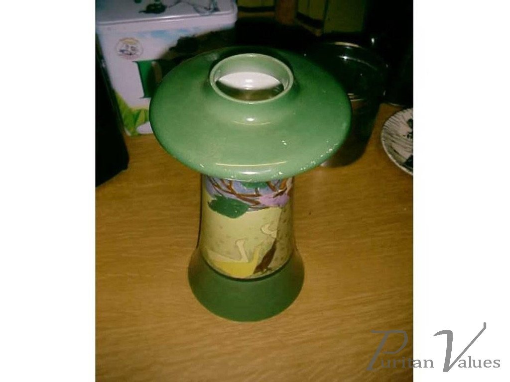 A hand-painted tulip style vase designed by Edward Spencer with a Pre-Raphaelite Maiden amongst Geese. Small chip to the base.