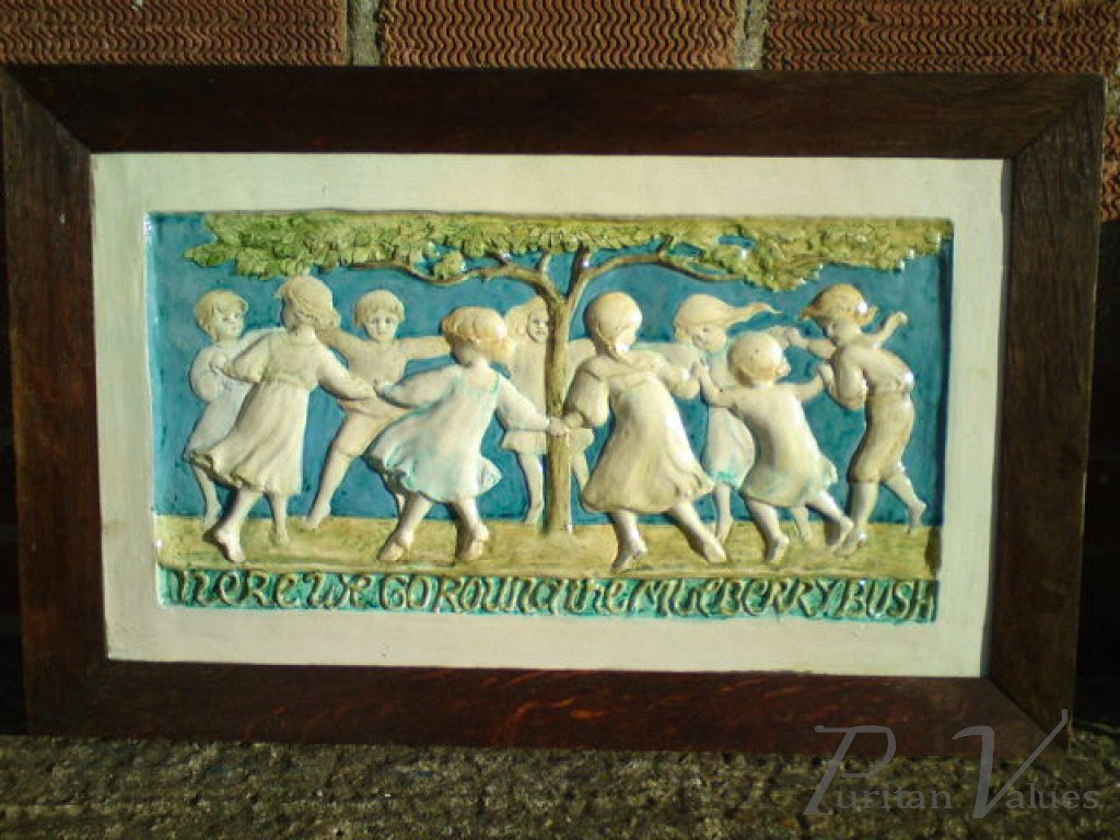 A Dellia Robbia wall plaque by Ellen Mary Rope depicting the nursery rhythm 'Round and Round The Mulberry Bush' Actual plaque measures 22" 12 1/2" Frame measures 25" x 16".