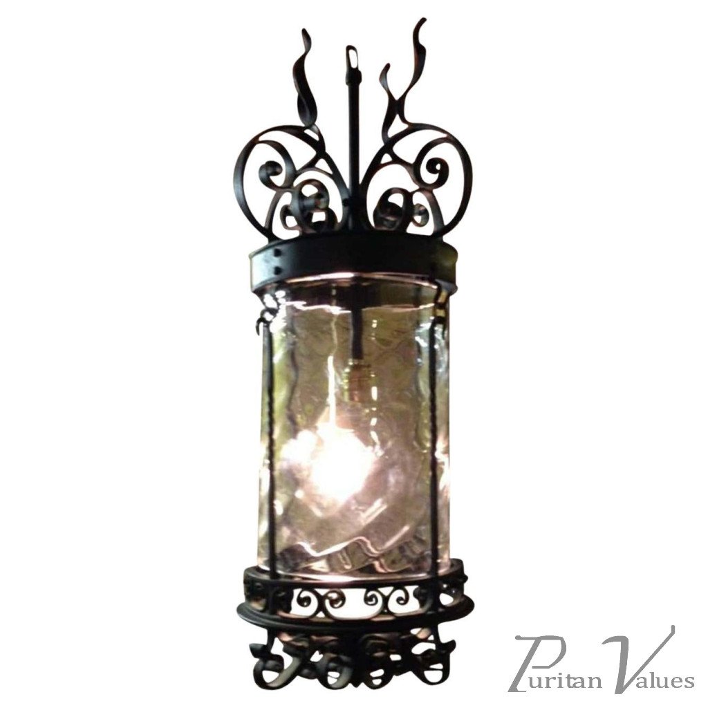 English Arts & Crafts Iron Lantern with Flaming Tendrils & Original Glass Liner