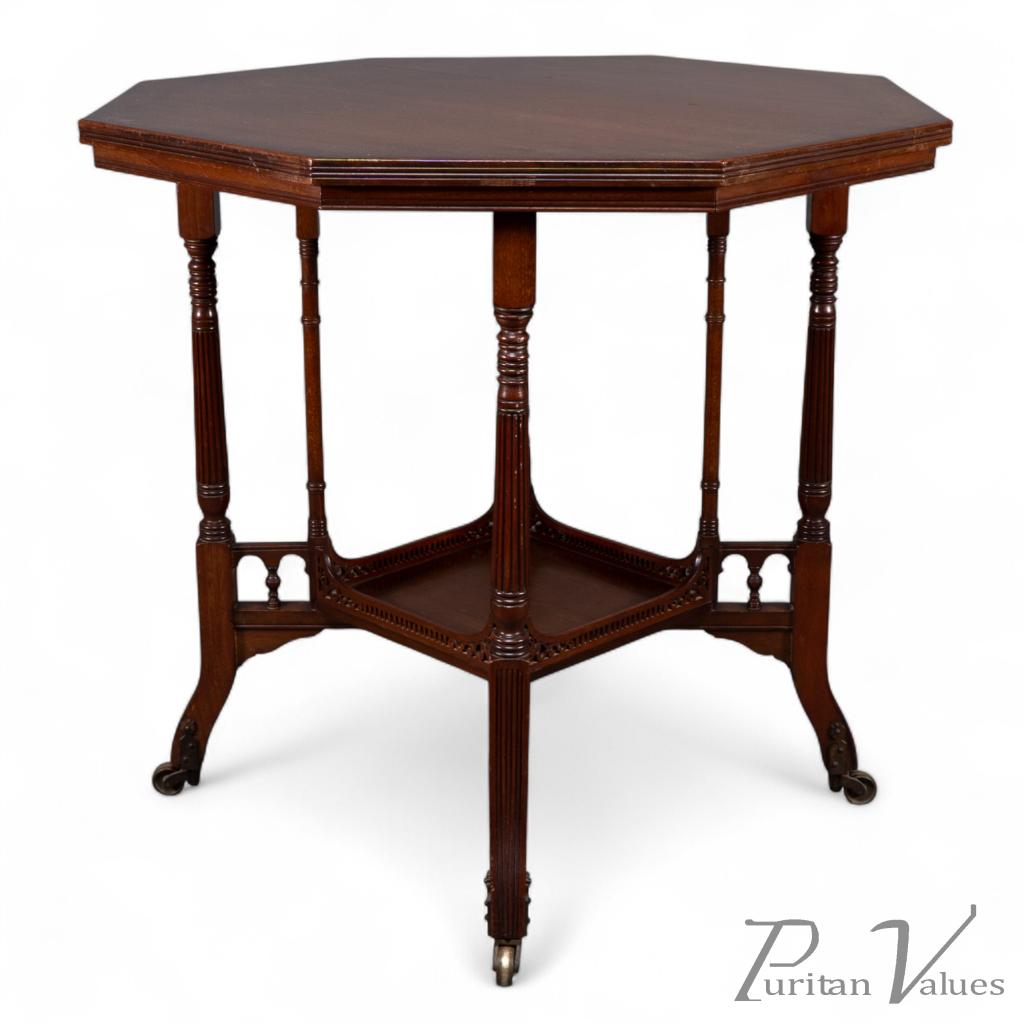 An Aesthetic Movement walnut centre or side table with four internal finely turned supports flanked by four turned legs united by a lower shelf with pierced gallery around, on very stylistic brass castors.