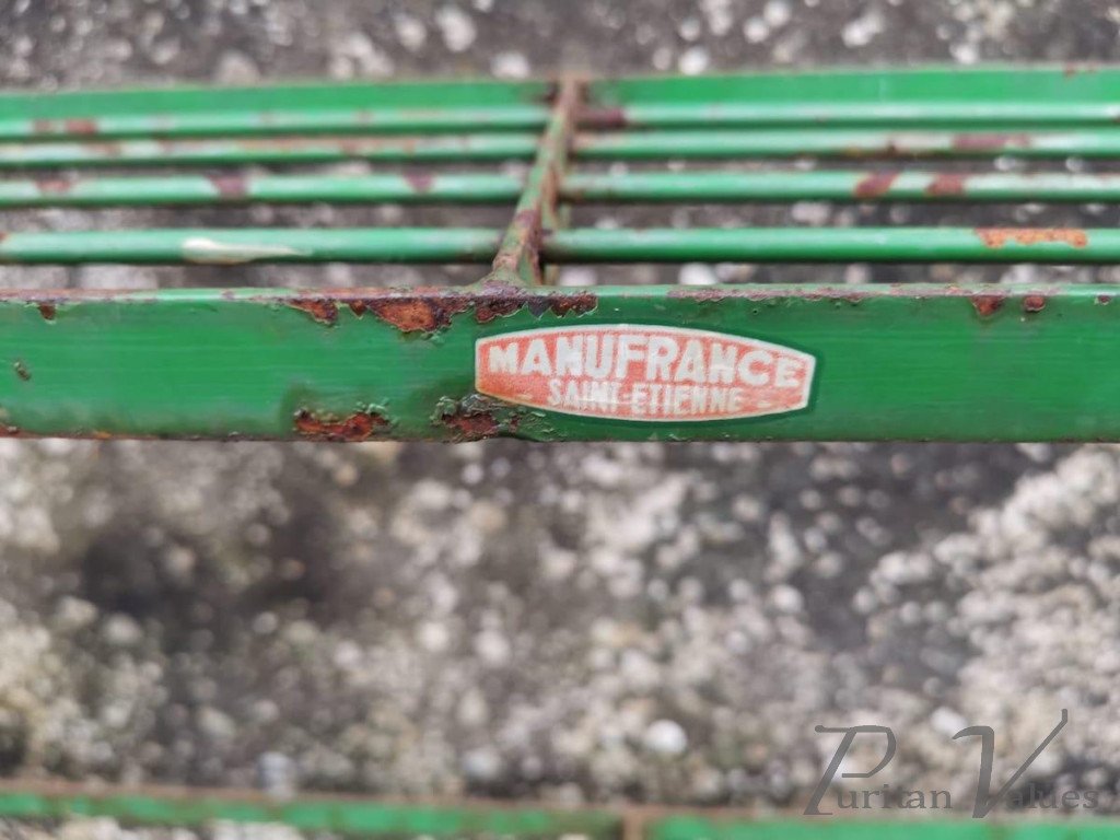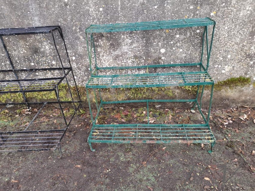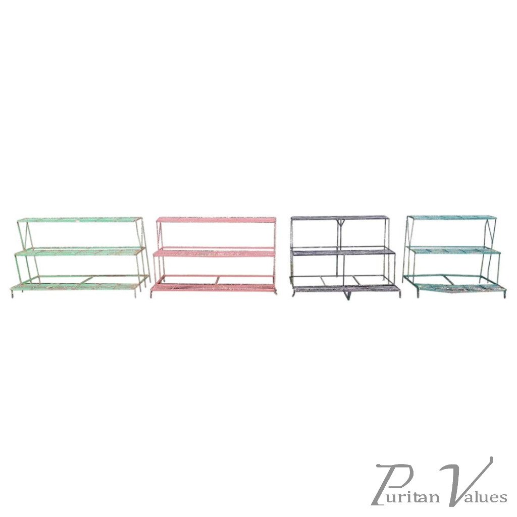 Four individual French mid century rectangular iron waterfall garden, green house or patio plant pot shelves or decorative stands. Can be used inside or out. One with original ' MA NU FR AN CE Saint Etienne' label. A great way to display your plants, herbs or bits and bobs. Priced separately. Measurements: Black, H 29. 5", W 38. 5", D 24" Blue, H 29. 5", W 30", D 20. 5" Green, H 29. 5", W 48", D 20. 5" Red, H 29", W 48", D 20. 5".
