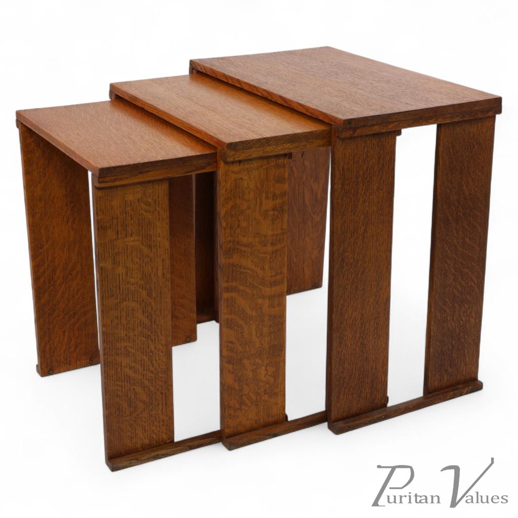 Frank Brangwyn (style of). A nest of three light oak modernist side tables of planked construction