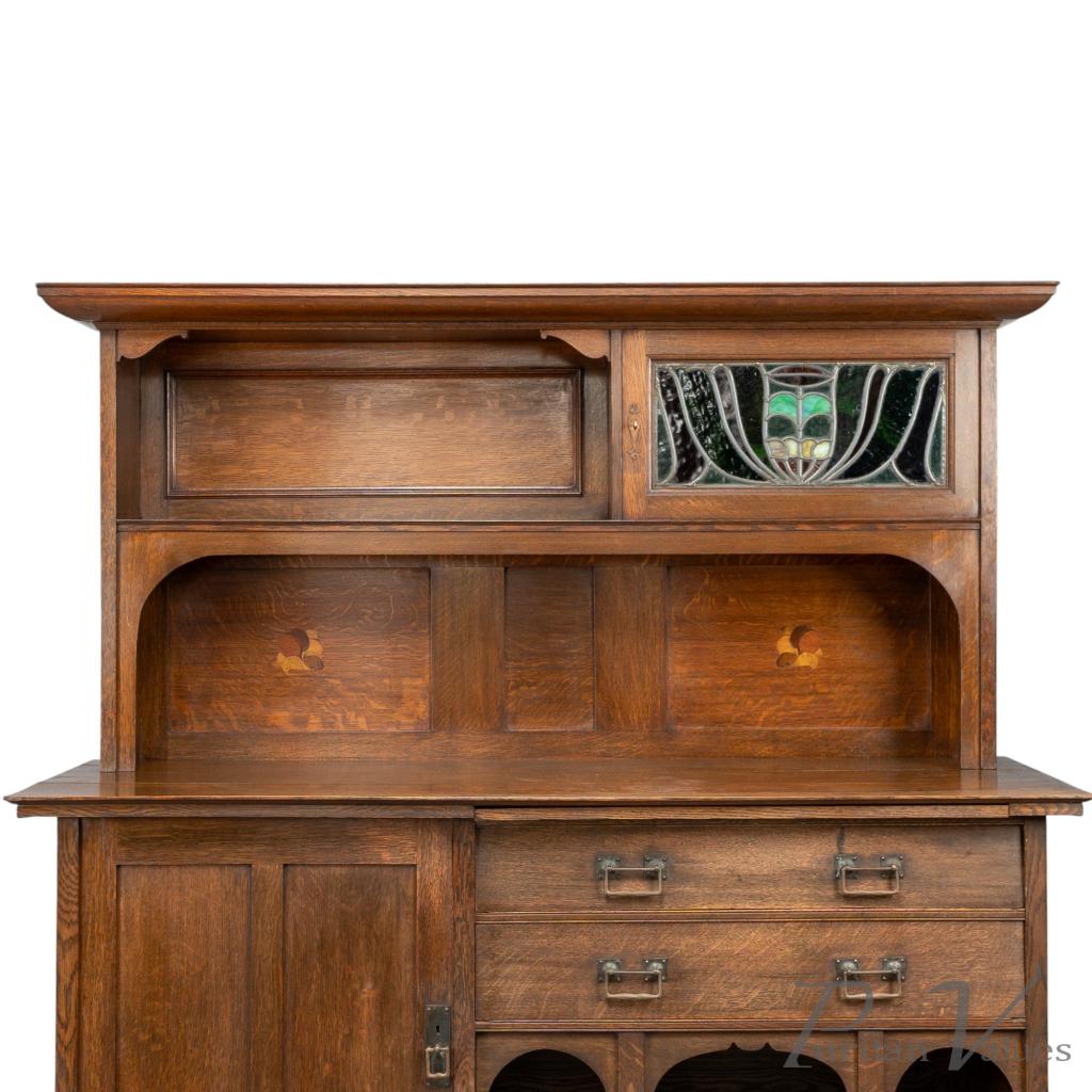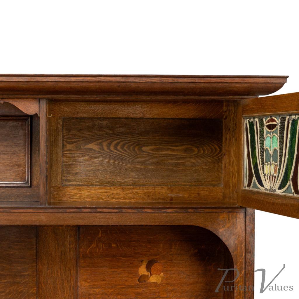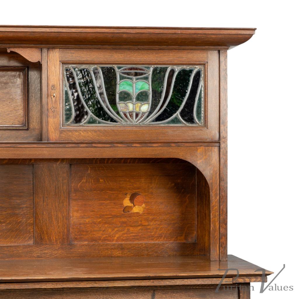 Arts and Crafts Glasgow style oak sideboard made by Bath Cabinet Makers, with stained glass panel to the upper right-hand cupboard, and stylised floral inlaid details with tulip wood, stained sycamore, and walnut above the work area and to the cupboard door, and handmade handles.