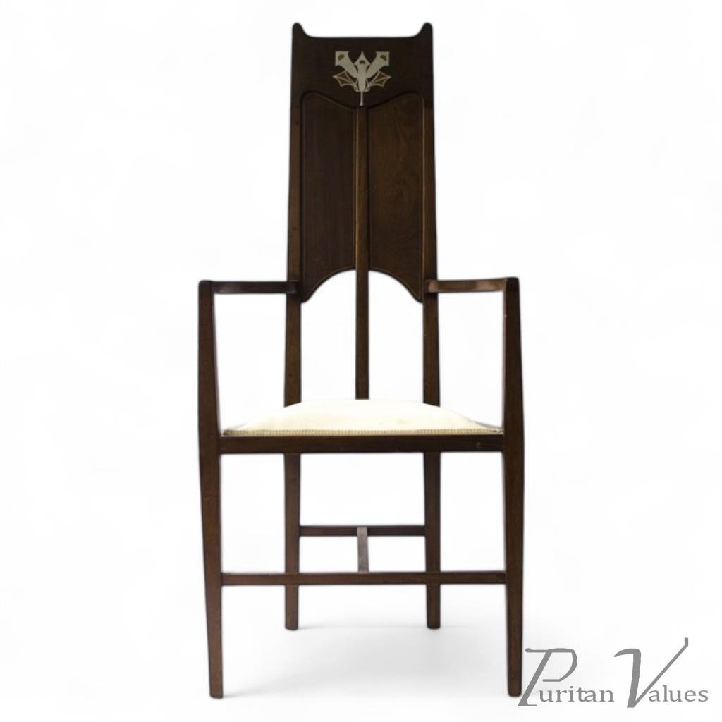 George Montague Ellwood (1875-1955) for J.S. Henry. A pair of mahogany armchairsmerly with a J. S. Henry label under. George Montague Ellwood (1875-1955) was a designer and interior decorator. He studied at Camden School of Art and later in Paris, Berlin, Dresden and Vienna. From 1916 to 1924 he was an editor for the journal 'Drawing and Design' and published 'English furniture and decoration, 1680-1800' in 1909 and 'The art of pen drawing: a manual for students, illustrators and commercial artists' in 1927, as well as other works. He lived in London and exhibited at a number of venues between 1899 and 1915, including four times at the Royal Academy. As well as the furniture for J. S. Henry and Bath Cabinet Makers he designed posters for the London Underground between 1912 and 1914. J. S. Henry were wholesale manufacturers of light, ornamental furniture from about 1880 and were based in Old Street, London. Art Nouveau pieces in mahogany and satinwood with decorative inlays were then made from the 1890s. Their pieces were retailed through a Paris agent at the 1900 Centennial Exhibition, where they won two silver medals. At the Arts and Crafts Exhibition Society in 1903 the company showed designs by George Walton and W.A.S. Benson. G.M. Ellwood was their most prolific designer. And although they used designs by C.F.A. Voysey, E.G. Punnett and W.J. Neatby, few designers were named.