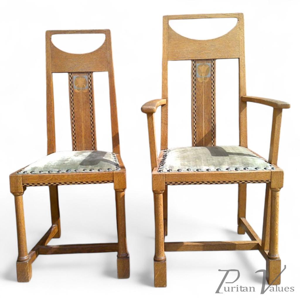 G M Ellwood for J S Henry. A rare and important Arts and Crafts oak armchair and matching side chair