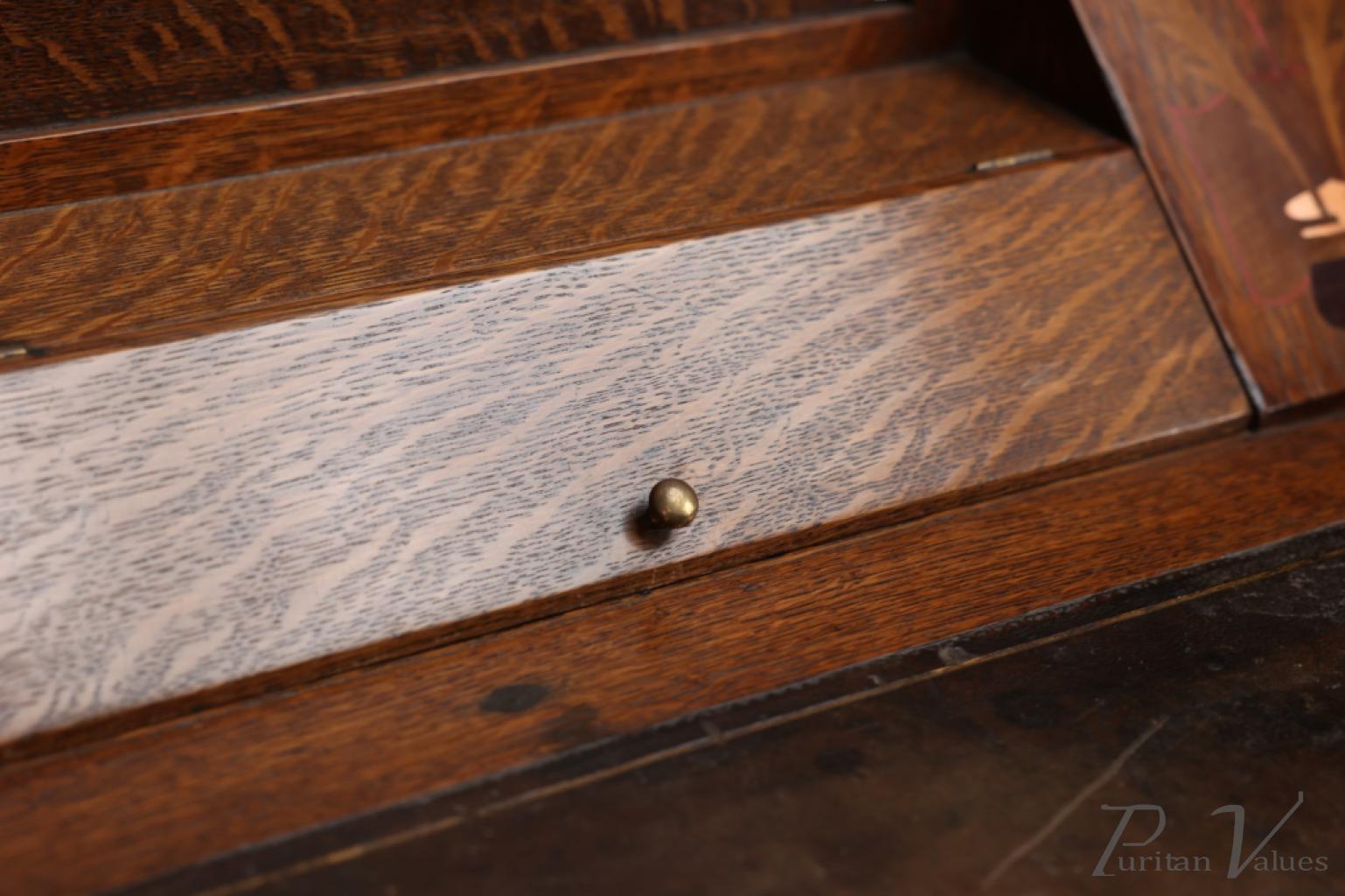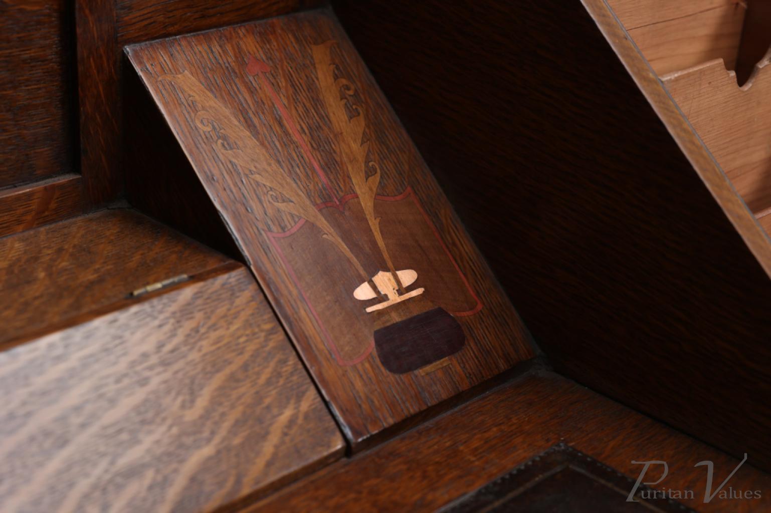 An oak writing desk with sloping pen compartment flanked by stylised inlaid decoration depicting a pair of quills in ink pots, the inlays of fruitwoods and copper.