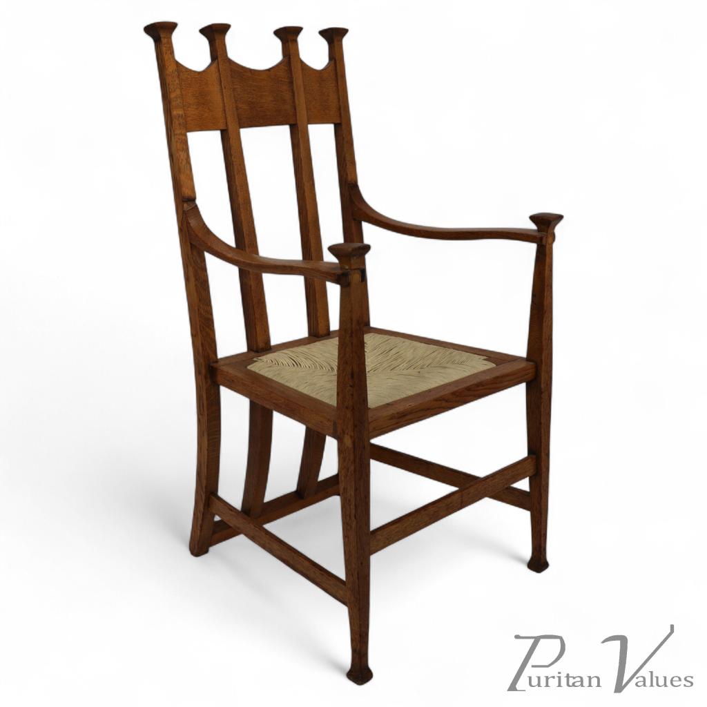 George Montague Ellwood. Made by J. S. Henry. A Pair of Matching Oak Dining Chairs with Throne Like Capped Tops