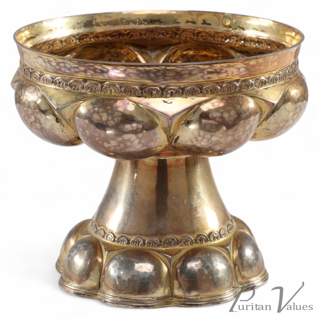The form is a compact medieval revival cup: a deep circular bowl above a short stem and a broad lobed foot, the junction encircled by a cast beaded arcade. The lobes are formed as raised bosswork (not planished), either repoussé from the inner skin or as applied cast bosses, then gilded. The full Chester hallmark group appears to the rim, maker GN/RH, lion passant for sterling, Chester town mark, and a date letter for 1910, corresponding to the 1901–25 date letter cycle.