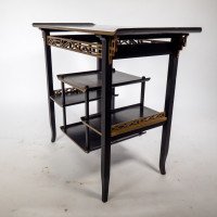 George Watson of Edinburgh. An Anglo- Japanese ebonized side table with hand carved edges to the shaped tops, lattice end panels, stepped display shelves, with a pagoda style curved edge.